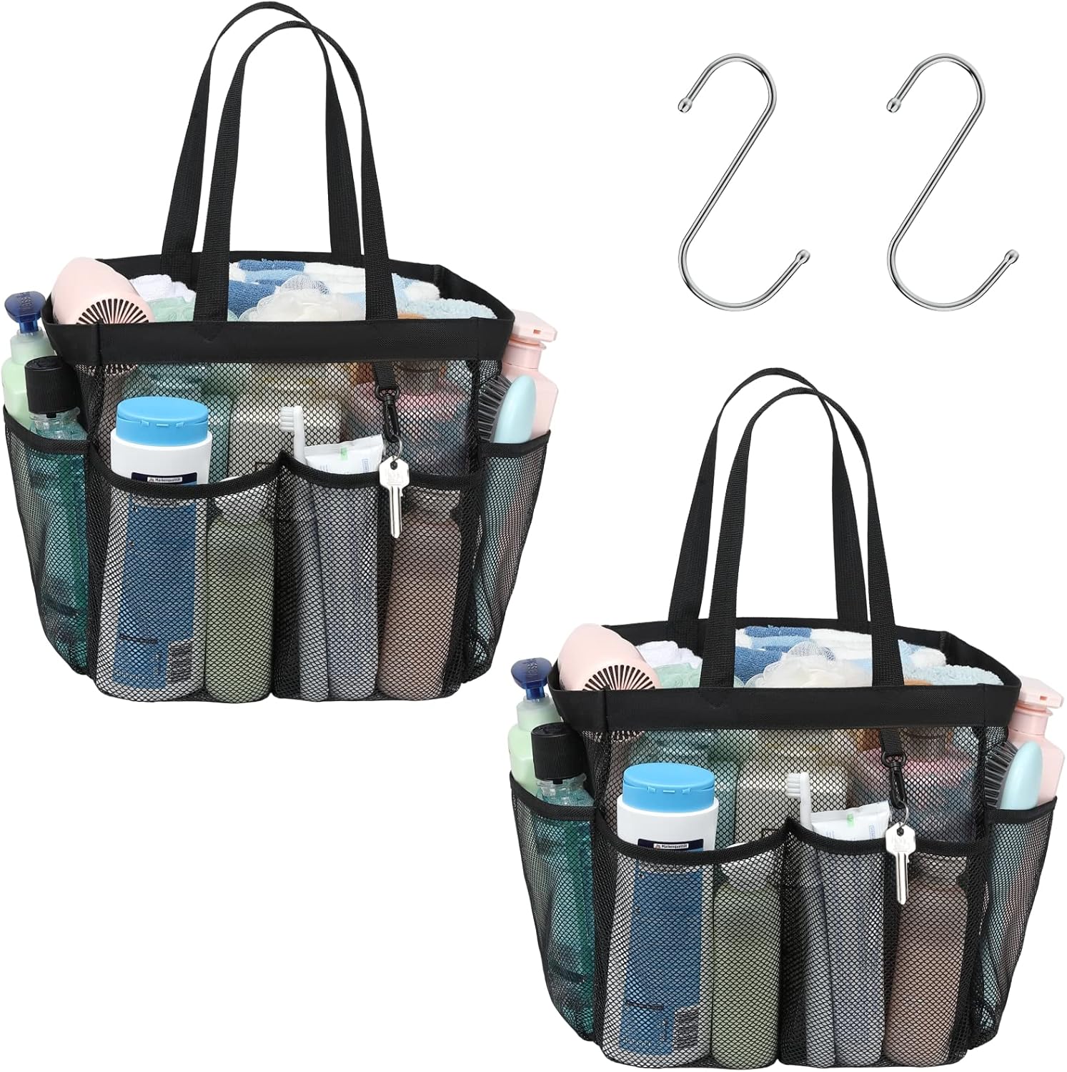 F-color Mesh Shower Caddy Portable, X Large 7 Deeper Pockets Shower Bag Basket Tote for College Dorm Room Bathroom Essentials Gym Camp Quick Dry 2 handles with S Hook, 2 Pack Black