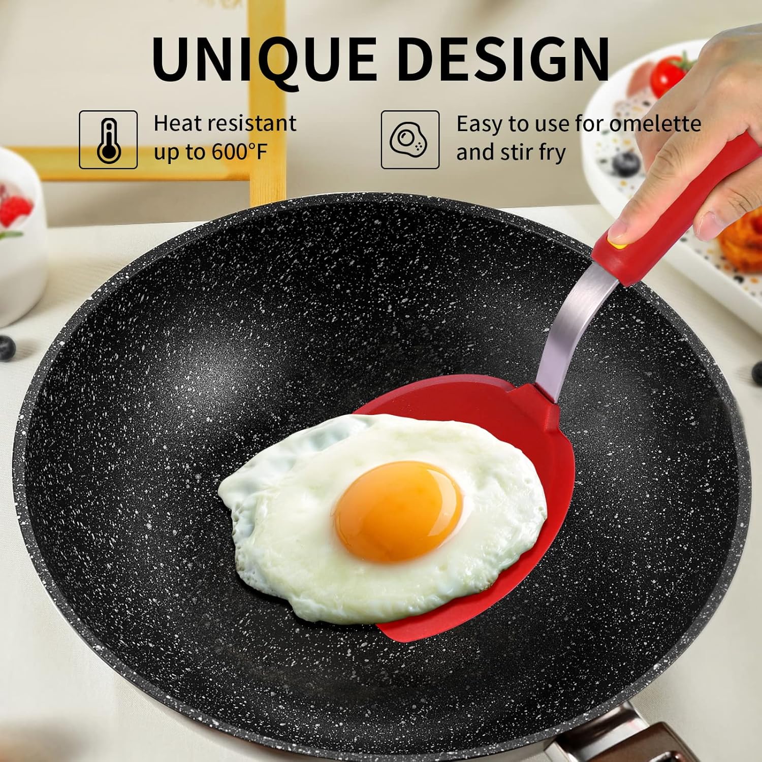 - 【Turner Spatulas silicone heat resistant 600°F】: This heat resistant spatulas is heat resistant up to 600°F, melt proof spatula will not melt like clinker or rubber, the heat resistance is excellent, and the anti-scald handle protects your hands better,it can meet the strict requirements of your for cooking.