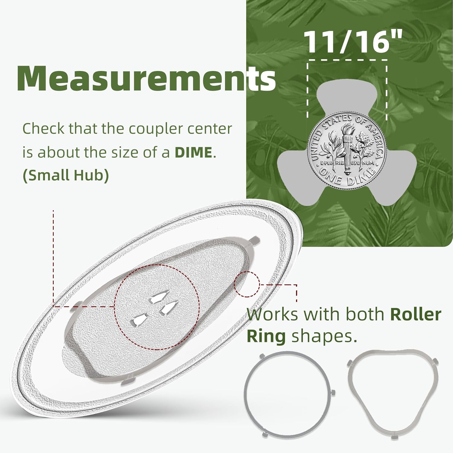 - 【Measurement 1】 This 12 in microwave glass turntable plate has a one-dime sized small coupler hole in the center. The center spot of the microwave oven plate coupler measures 11/16" in diameter