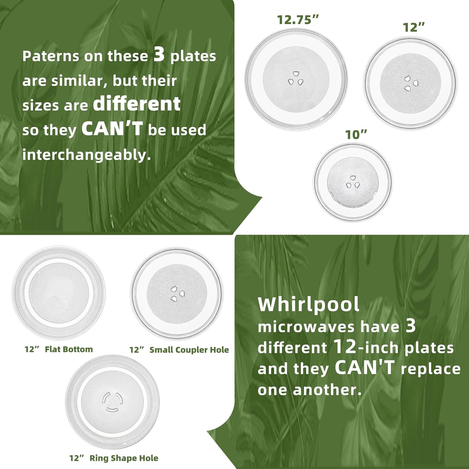 - 【LOOK OUT!】 Whirlpool microwaves have three different 12 inch microwave glass plate (AKA "Small Coupler Hole", "Flat Bottom", "Ring Shaped"), and they can't replace one another. Gemroom offers microwave plate replacement from 9.6" to 16.5", please click on "Visit the Gemroom Store" for more options