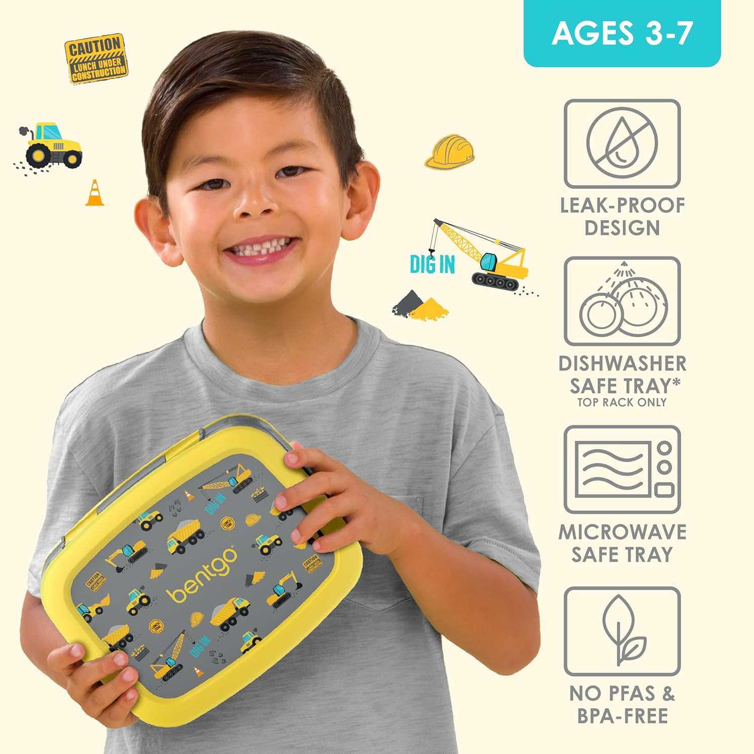 Bentgo Kids Prints Leak-Proof, 5-Compartment Bento-Style Kids Lunch Box - Ideal Portion Sizes for Ages 3-7, Durable, Drop-Proof, Dishwasher Safe, & PFAS & BPA-Free Materials (Construction Trucks)