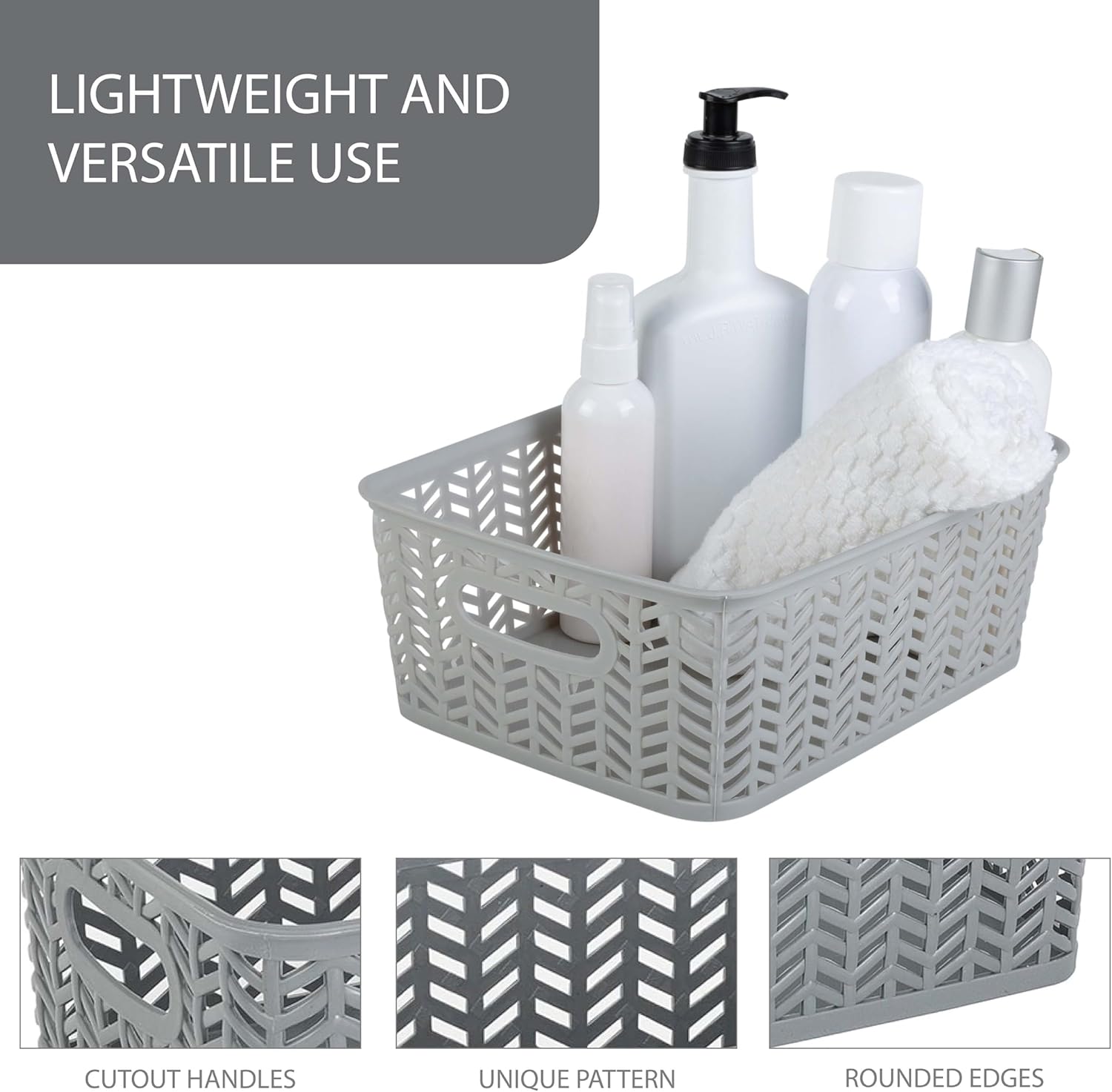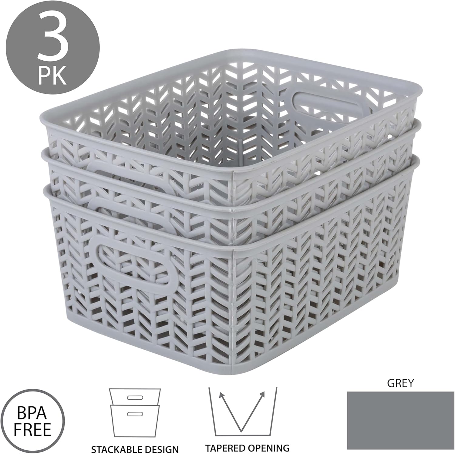 Simplify 3 Pack Small Herringbone Storage Basket | Dimensions: 10"x8"x4" | 2 Open Handles | Lightweight | Grey | Herringbone Design | Home Organization