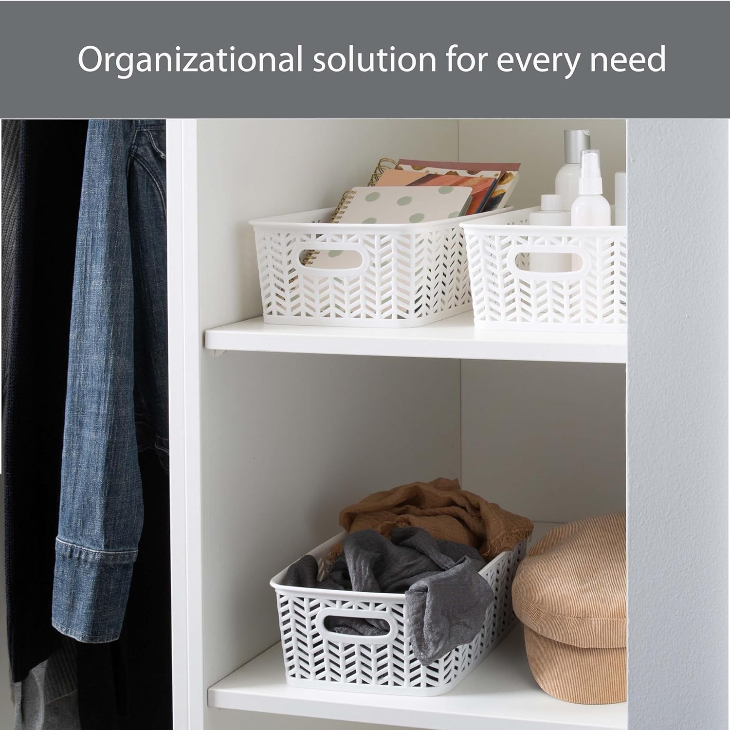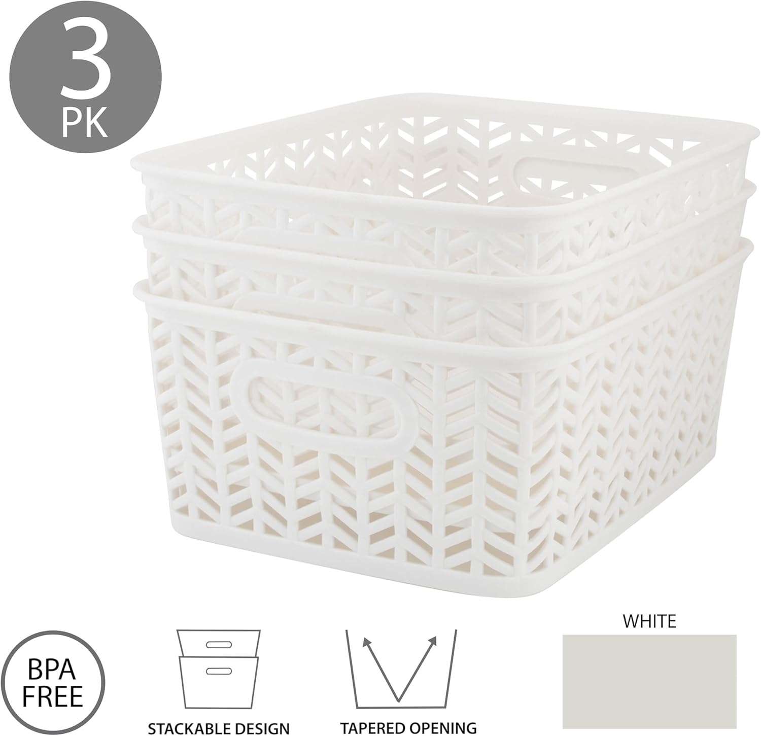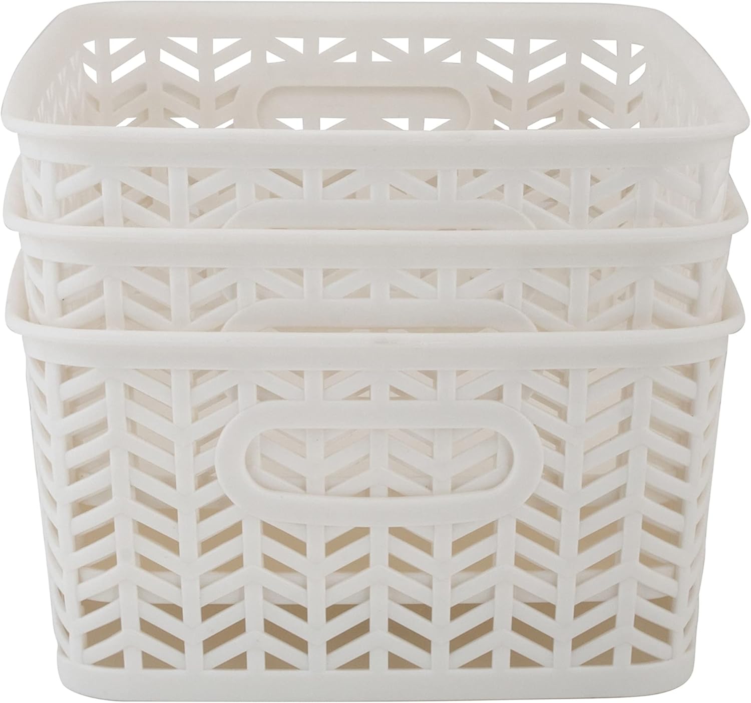 Simplify 3 Pack Small Herringbone Storage Basket | Dimensions: 10"x8"x4" | Light Weight | Two Open Handles | White | Organization | Many Uses | Kitchen Storage | Bathroom Storage |