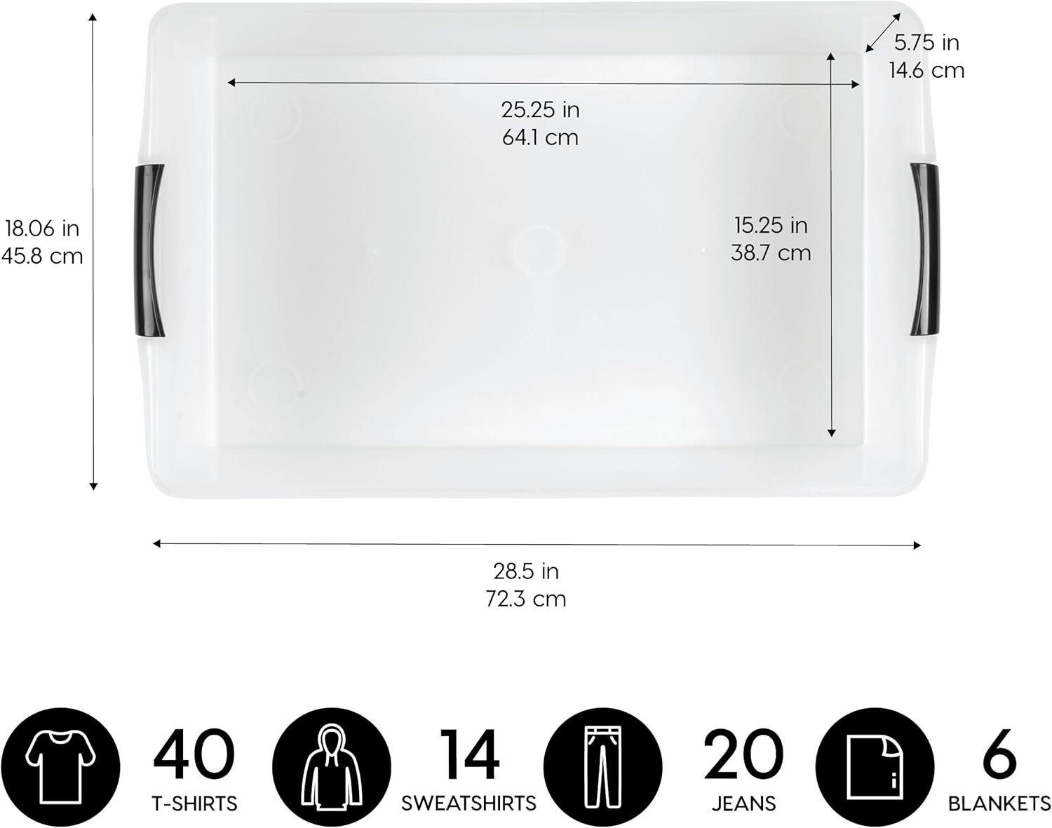- MADE IN USA: These bins are made in the USA with high-quality global materials and are BPA-free. Dimensions: 28.5"L X 18.06"W X 5.75"H (Inside:25.25"L X 15.25"W X 5.75"H)