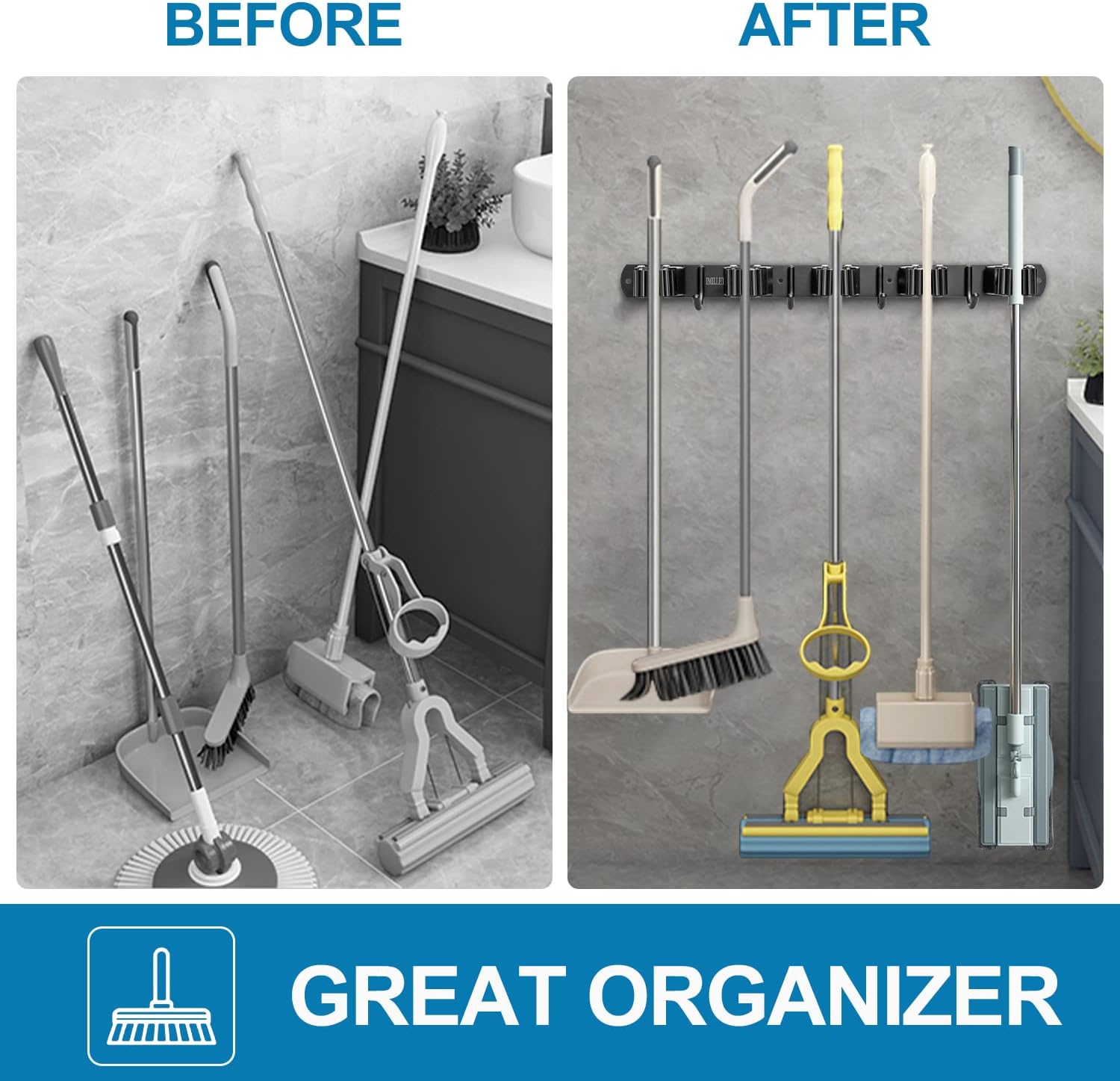 - VERSATILE DESIGN: You can easily organzier your home, such as laundry room, kitchen, closet, garage, pantry, basement. This garage organizer also works garden or a shed. You can easy access your broom, mop, swifter, dust pan, small vacuum, rakes, shovels and more
