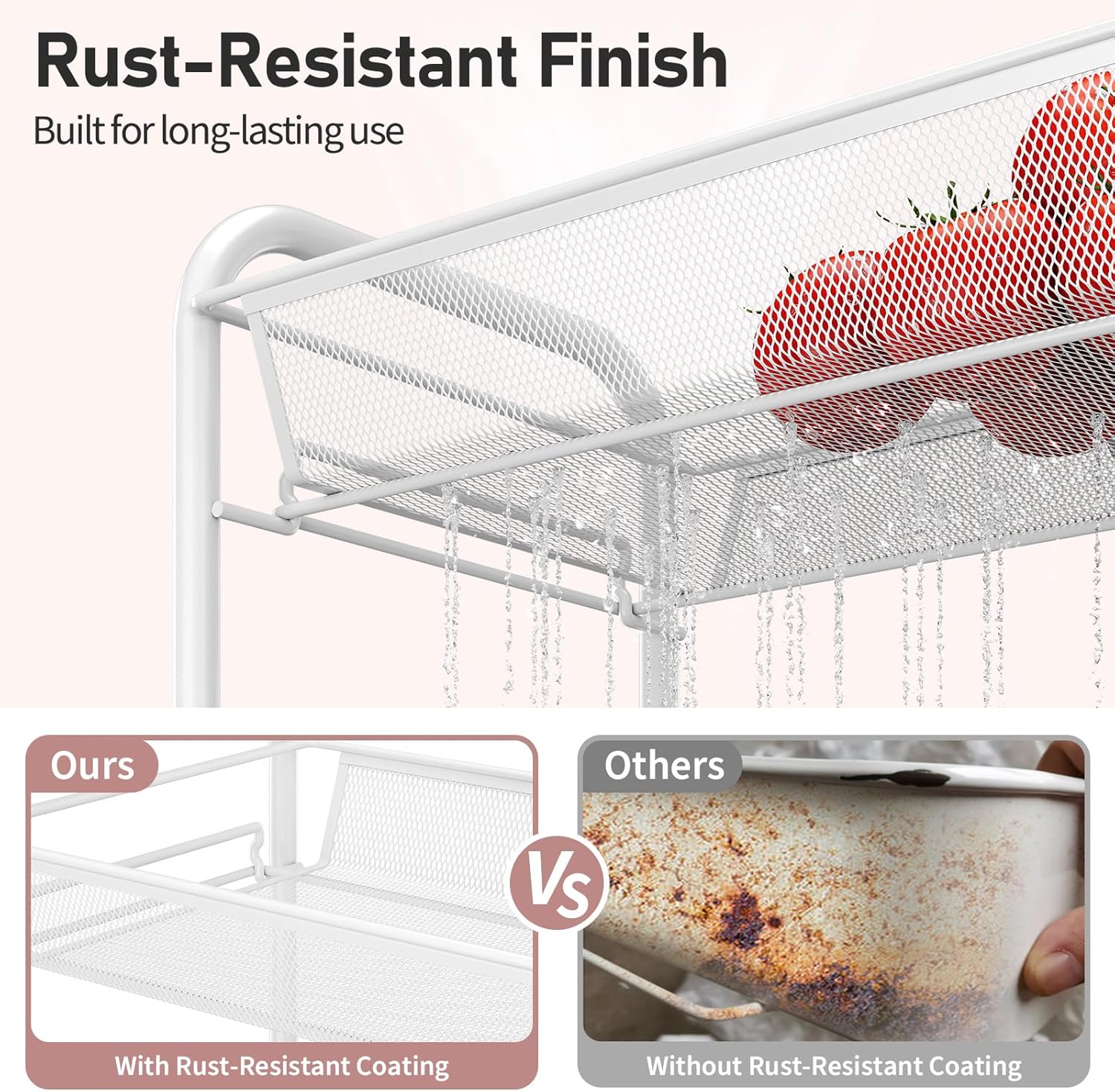 - 【Breathable Mesh Basket】Our rolling utility cart with breathable mesh basket, convenient for draining. Basket with 6cm (2.4") heighten edge to prevent items dropping and with good load-bearing capacity. The weight capacity of each metal basket is up to 5 kg