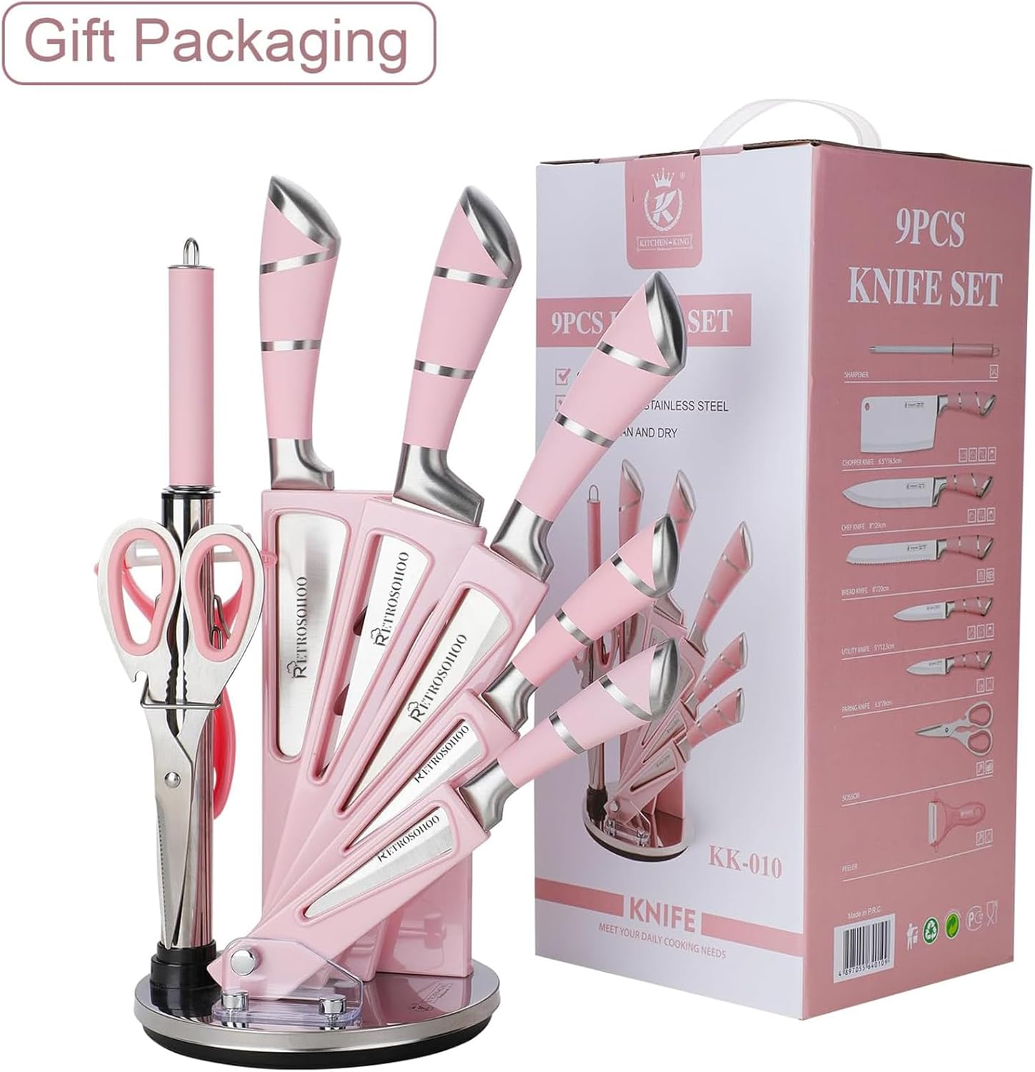 - 【All-in-One】This pink set of knives includes: Chef Knife, Slicing Knife, Bread Knife, Utility Knife, Fruit Knife,Knife Sharpener,Kitchen Scissors,Peeler,Rotary Knife Holder.This 9-piece kitchen knife set is widely used for cutting, slicing, shearing, chopping, and can meet your various cutting needs while cooking.