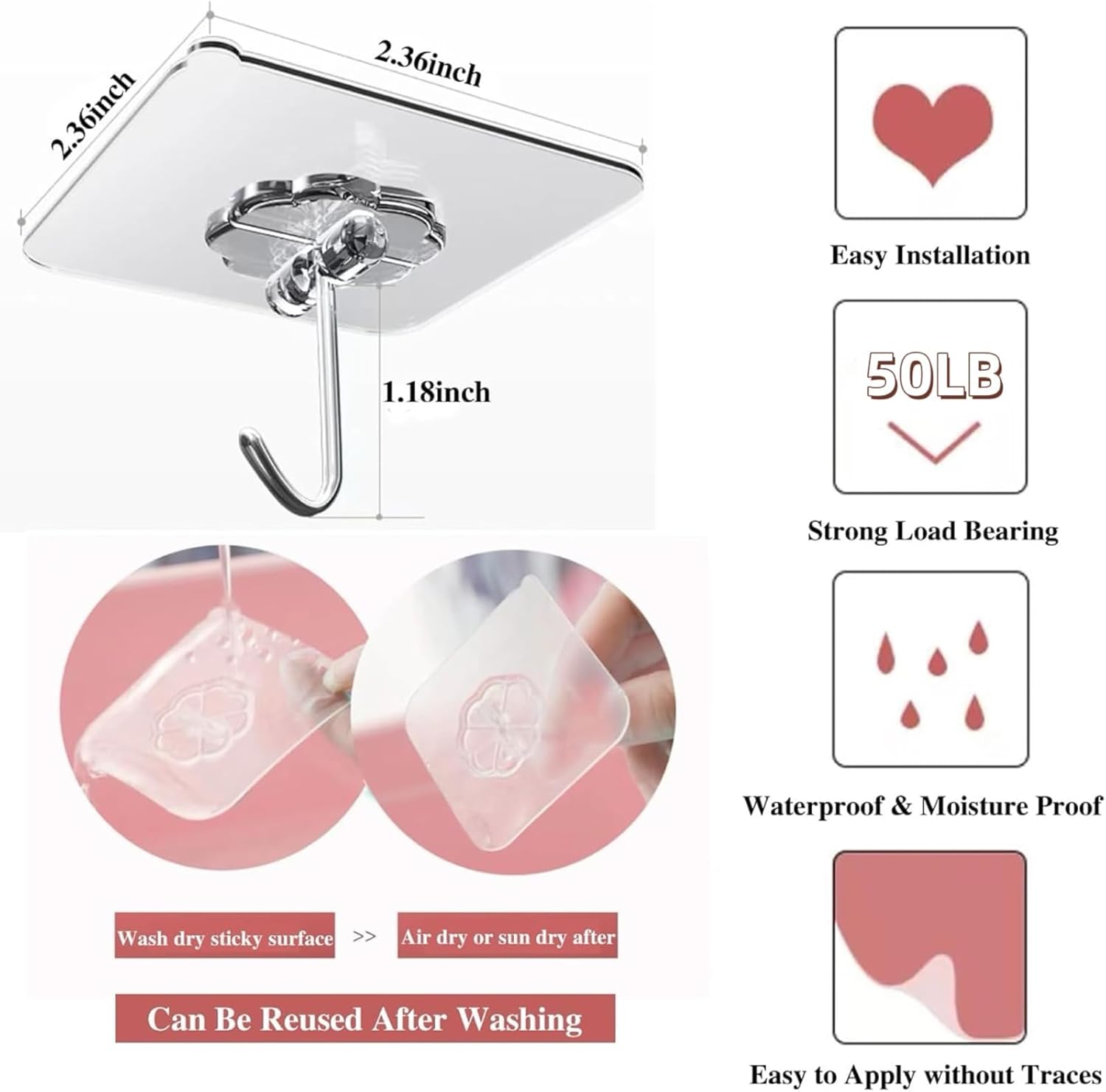 - Easy to Use: The wall hooks are very easy to attach, no nails or holes to drill, won't damage your walls, easy to remove, won't damage the surface of your walls, adhesive wall hooks can be used again and again after cleaning and drying