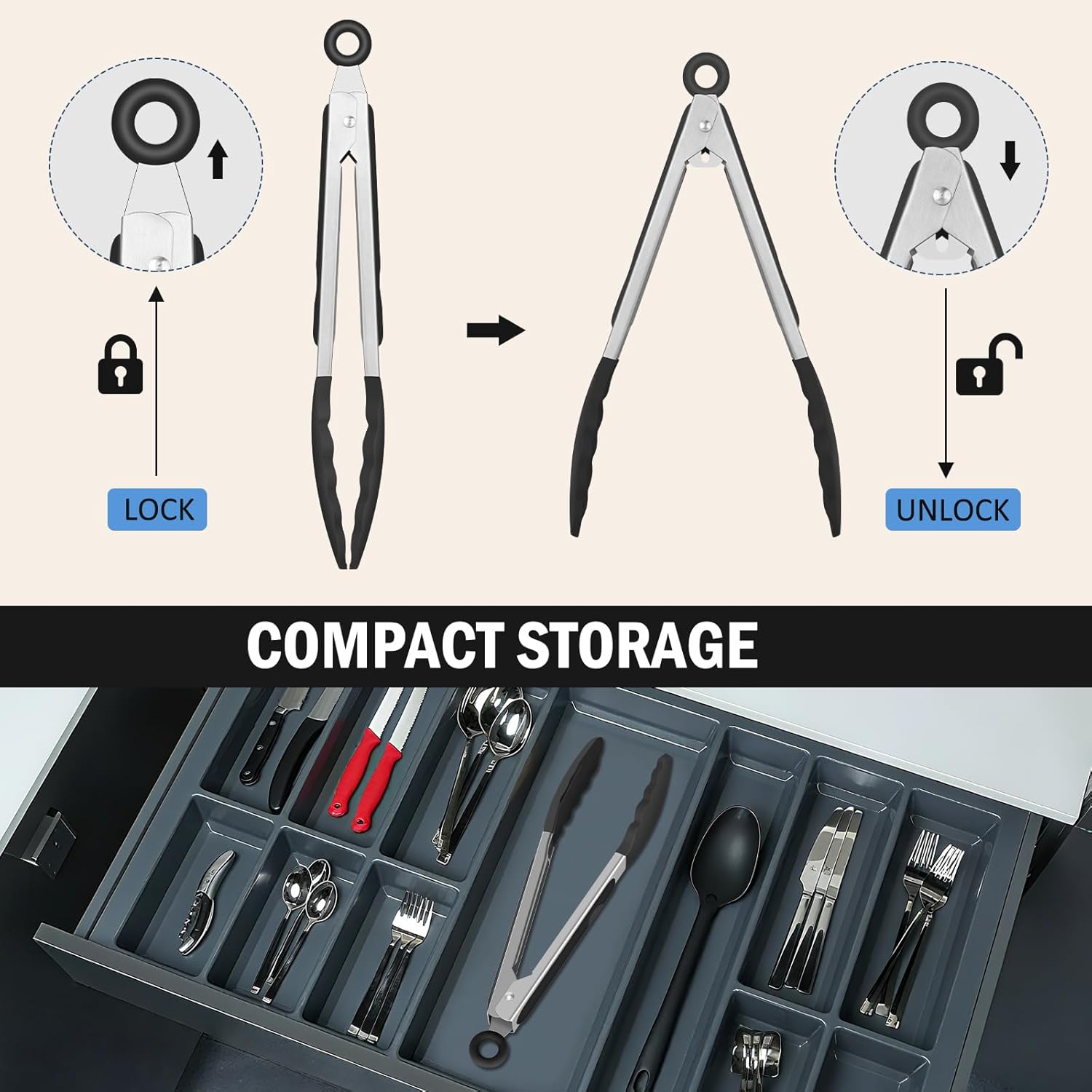Kitchen Tongs, Stainless Steel Silicone Tongs for Cooking 600ºF High Heat-Resistant BBQ Grilling Locking Tongs, Set of 2-9" and 12" Black