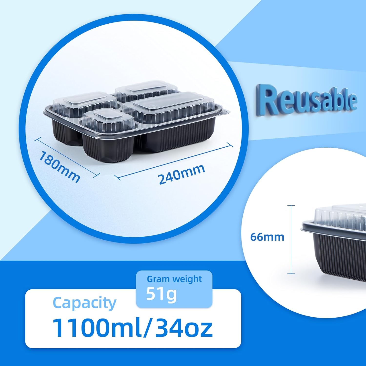 - ✓34OZ ASIAN MEAL OPTIMIZED: 24cm x 18cm x 6.6cm, 4 compartments for rice / 3-dishes or noodles / toppings.