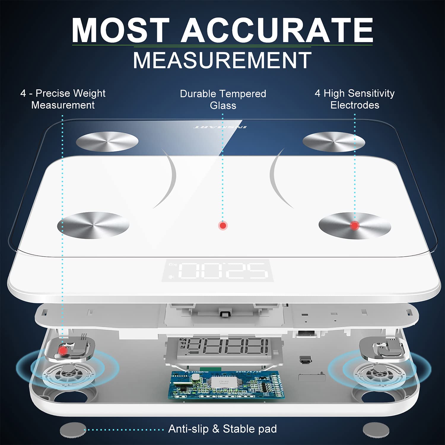 - 【HIGH ACCURACY WEIGHT SCALE】This ultra-precision scale for body weight, adopting the advanced BIA technology,the health scales is equipped with 4 high sensitive electrodes and 4 high precision and electrodes to ensure the accuracy.The digital scale self-Illuminated LED display provides clear readout at any angle.The fat scale ensures accurate measurement results to within 0.2lb/ 0.05kg and has a maximum weight capacity of 400lb/180kg