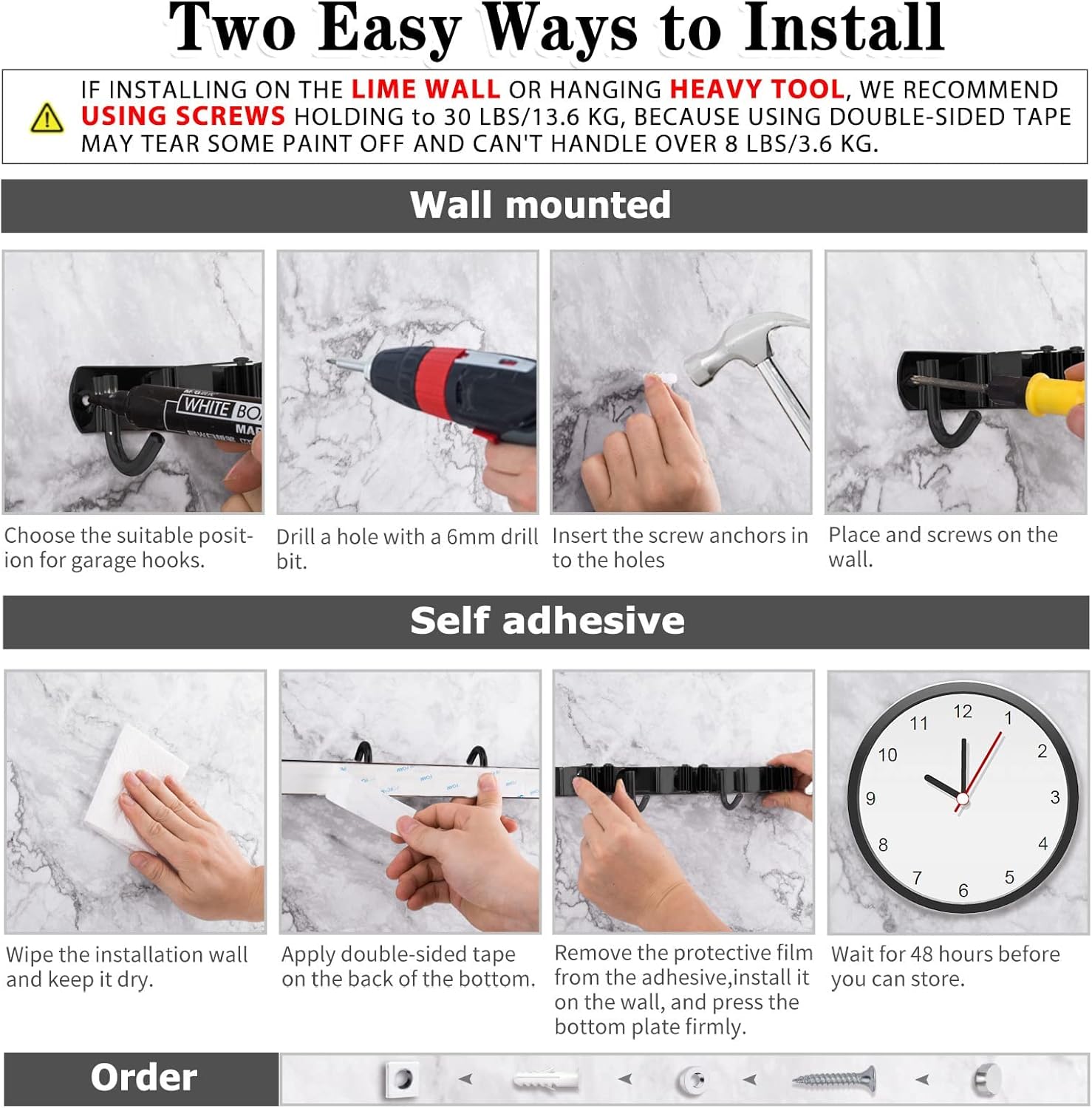 - Easy installation: Two ways to install the mop holder within minutes designed for different installation surfaces. Broom holder wall mount self adhesive for smooth surfaces, screw drilling wall mounted for rough surfaces. (For weighty or outdoor hanging, screw drilling is recommended)
