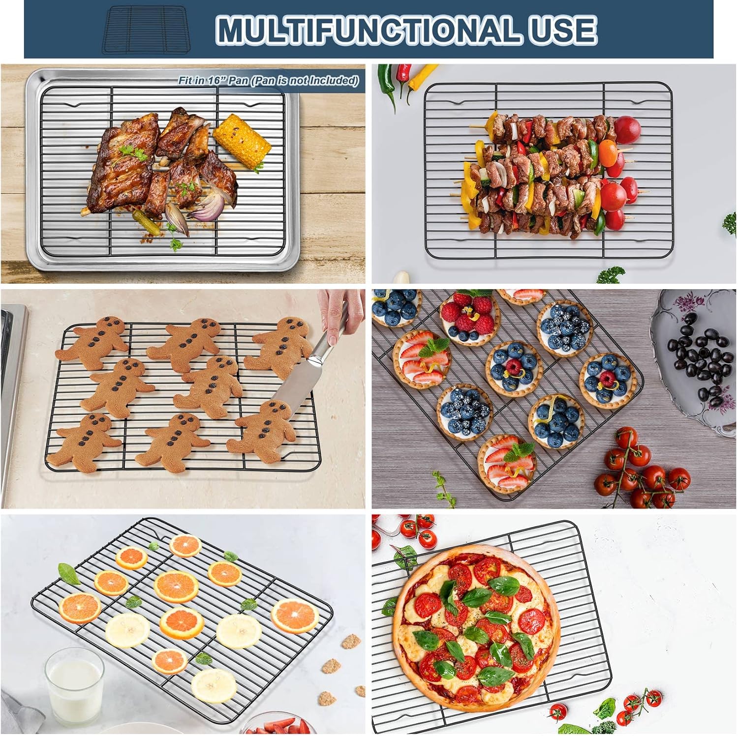 - 【15.3 INCH & 2PCS】 15.3” Grilling racks could fit in 16” sheet pans, Using racks only or using with pans is on your choice to meet different baking needs, 2-Pieces large size racks are convenient to bake food for family gathering or friends party, Good for baking cake / bread, roasting chicken / meat, Cooling cookies or fried food, A wonderful gift for yourself or others
