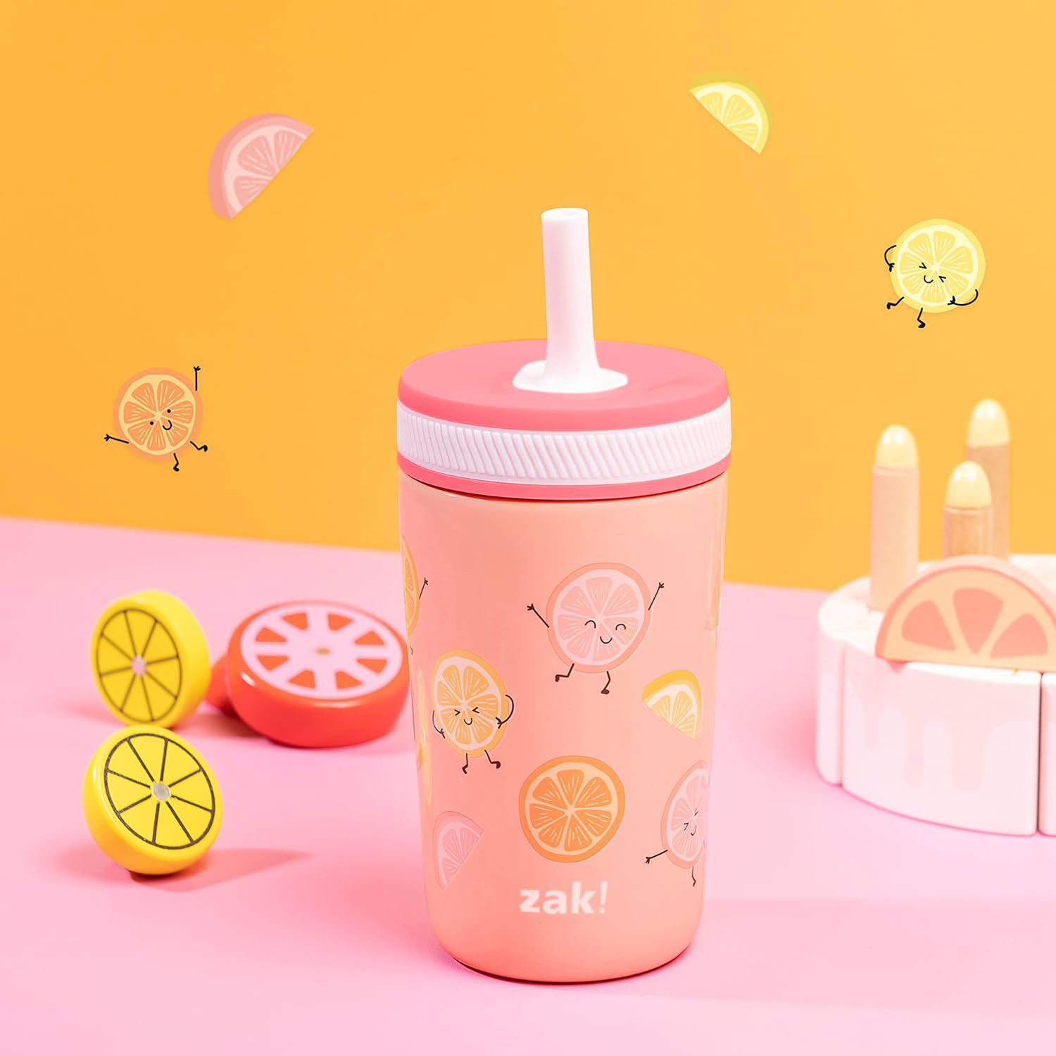 Zak Designs Kelso Tumbler Toddler Cup For Travel or At Home, 12oz Vacuum Insulated Stainless Steel Sippy Cup With Leak-Proof Design is Perfect For Kids (Happy Fruit)