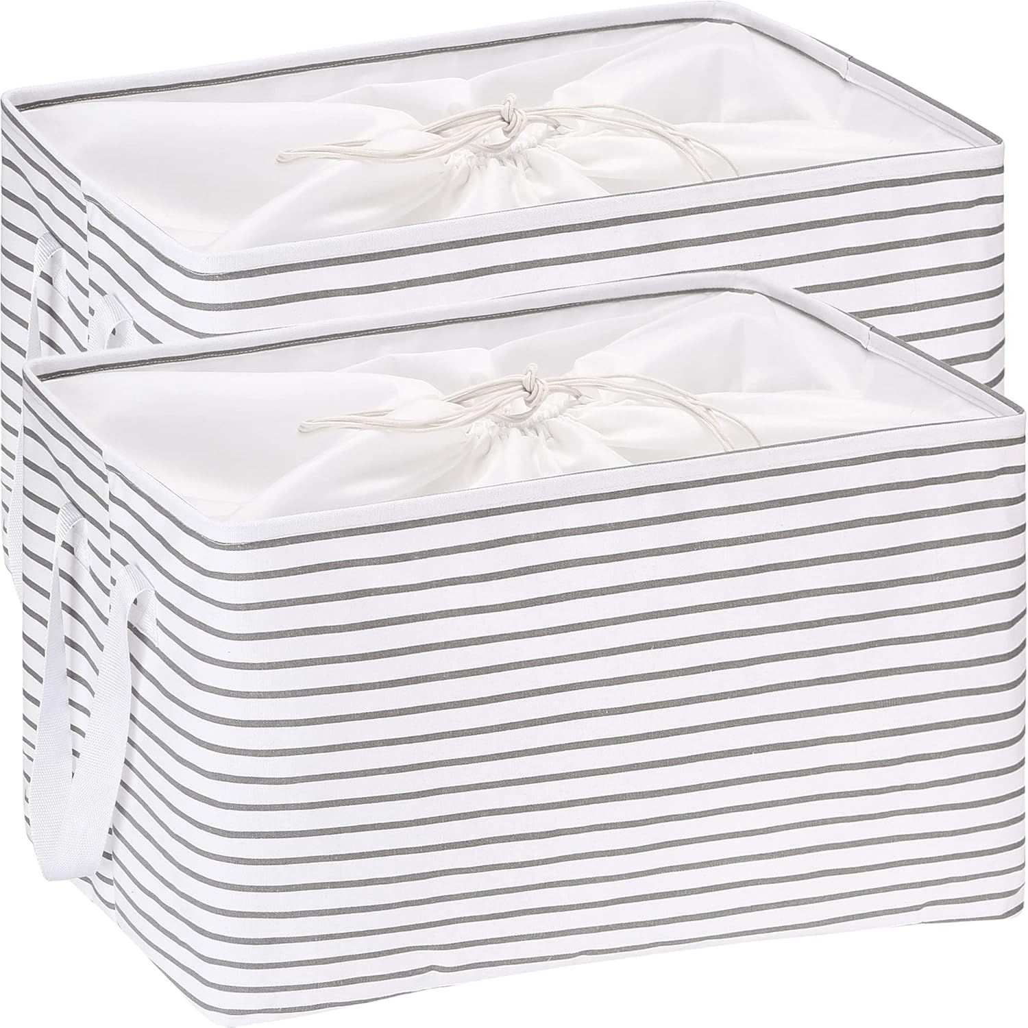 Hinwo 102L XXL Storage Bins, 2-Pack Closet Organizers and Storage, Foldable Clothes Storage Baskets with Handles, Containers for Clothing, Blanket, Comforters, Toys, Bedding (Gray Stripe)