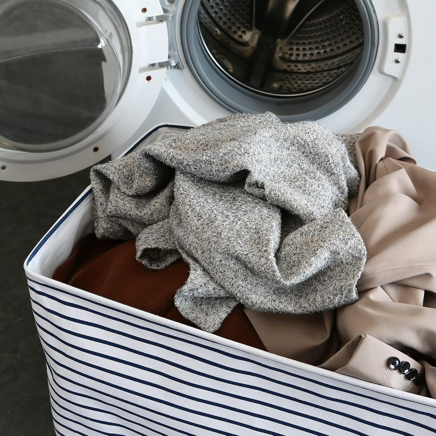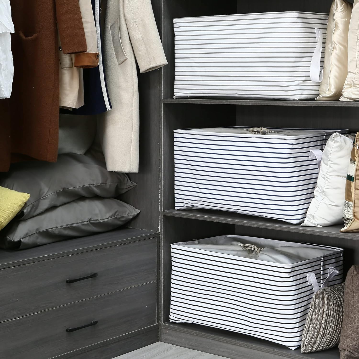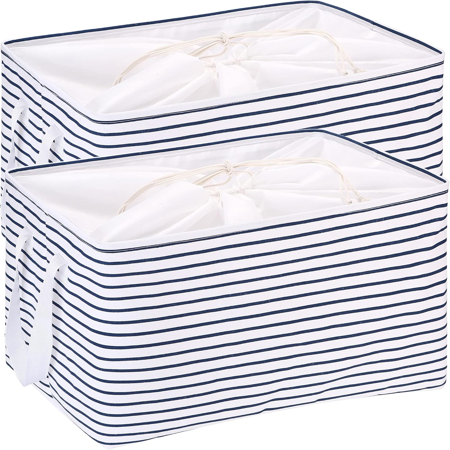 Hinwo 102L XXL Storage Bins, 2-Pack Closet Organizers and Storage, Foldable Clothes Storage Baskets with Handles, Containers for Clothing, Blanket, Comforters, Toys, Bedding (Navy Stripe)