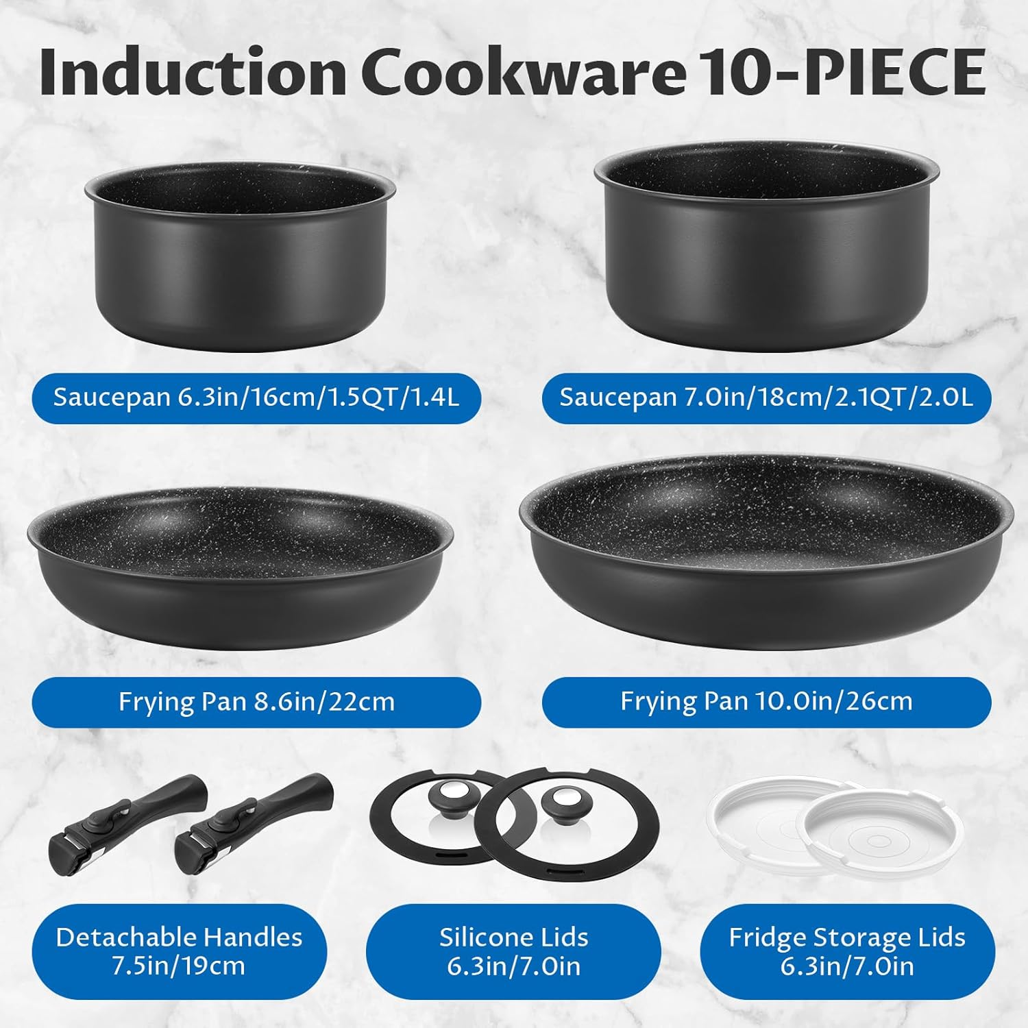 - This 10 Piece Non Stick Pots and Pans Set Includes: 2 saucepans (1.5 and 2.1 quarts), 2 frying pans (8.6 and 10 inches), 2 removable handles, 2 silicone lids, 2 sealing lids for easy storage or refrigerator storage.