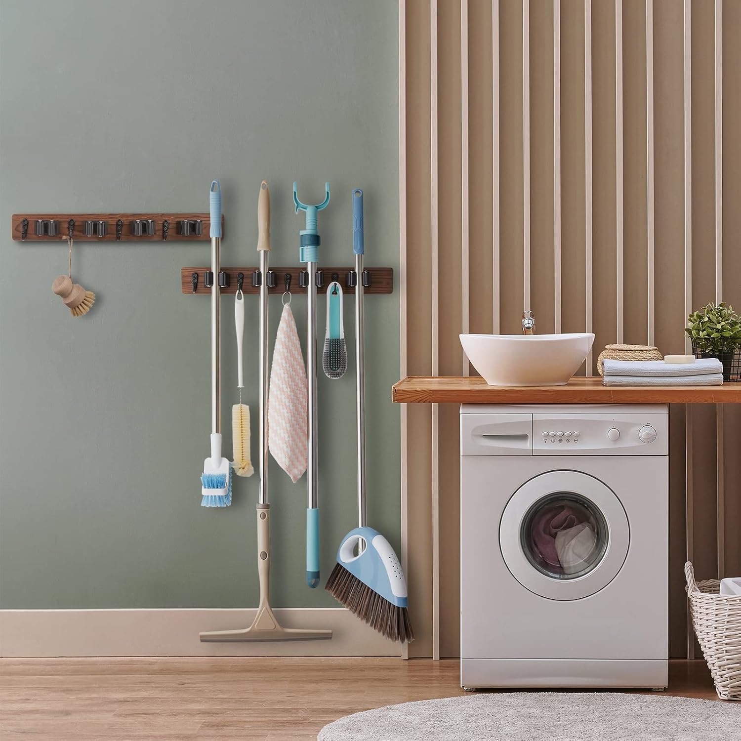 - ORGANIZE AND SAVE SPACE - The wall mounted mop and broom holder provides you easy access to store and grab brooms, dustpans, and mops, while also freeing up closet space. Keep your cleaning tools organized and and within reach.