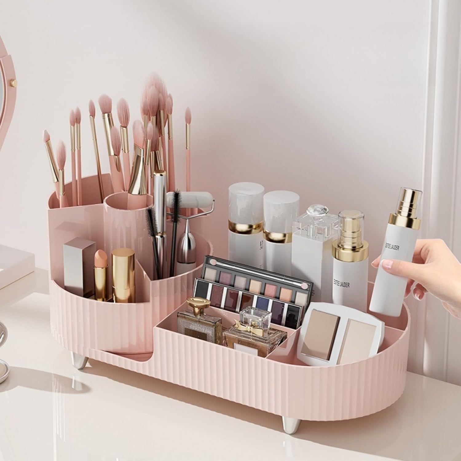 Rotating makeup organizer,Large Capacity Cosmetic Display Case, easy to hold all of your makeup products, at least 20 makeup brushes/eyeliner,10 lipsticks,8 skincare products(Pink)