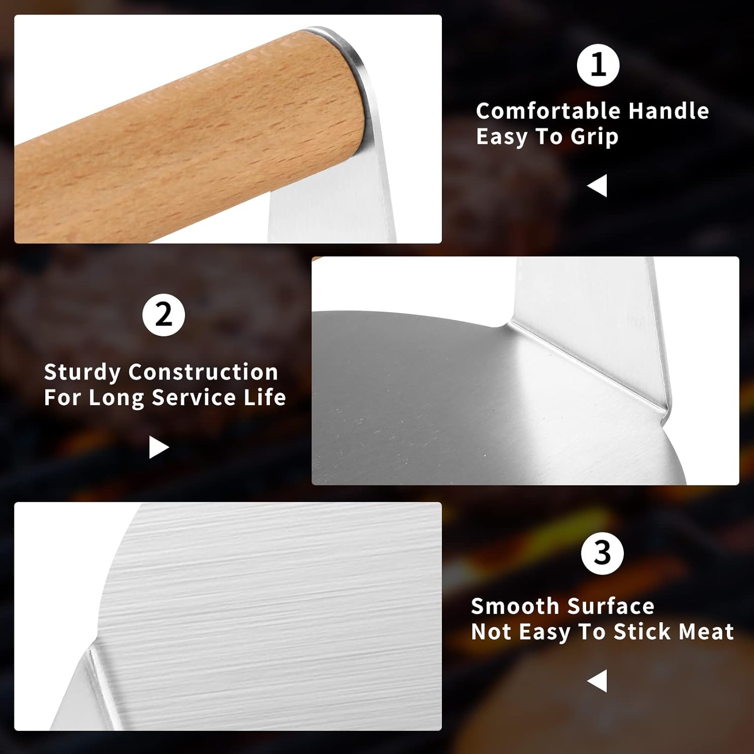 - Perfect Burger Companion: Our burger press not only flattens patties but also distributes heat evenly, resulting in thinner, crispier hamburgers. It's also essential utensil for grilling bacon, melting cheese, and creating delicious Panini on a flat top pan.
