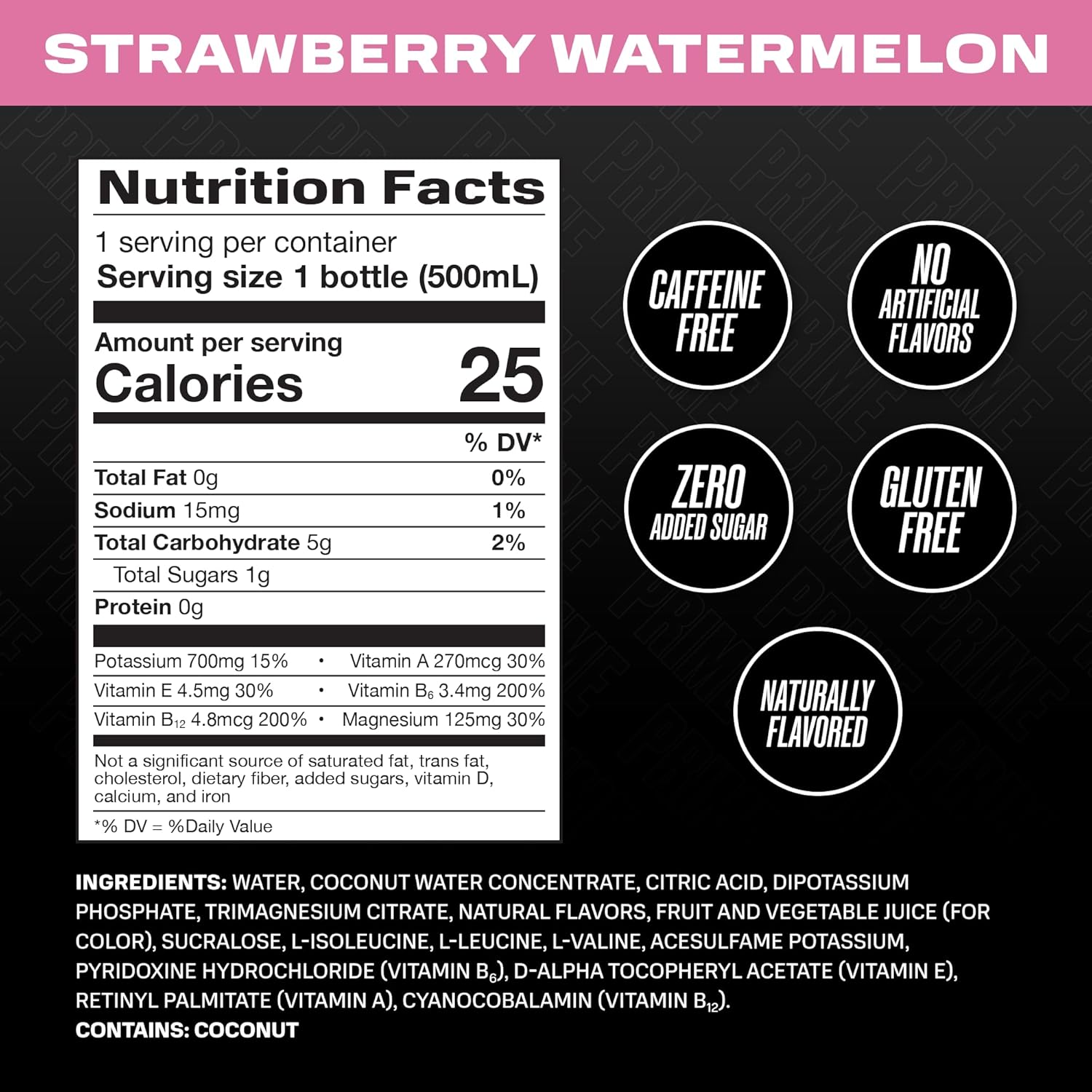 - NO ARTIFICIAL COLORS OR FLAVORS: Every bottle is naturally flavored and contains zero caffeine, zero added sugar, no artificial colors, and is gluten free. With 834mg of electrolytes, essential B vitamins, antioxidants, and coconut water, Prime delivers clean, functional hydration when you need it most.