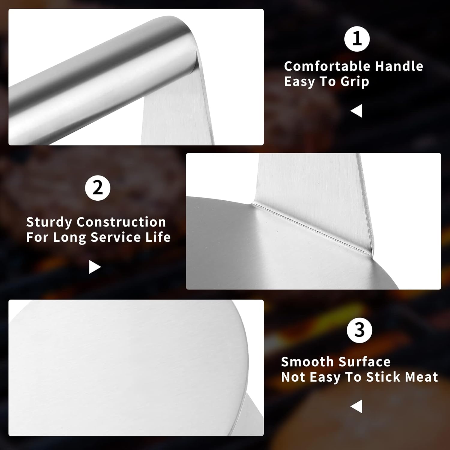 - Perfect Burger Companion: Our burger press not only flattens patties but also distributes heat evenly, resulting in thinner, crispier hamburgers. It's also essential utensil for grilling bacon, melting cheese, and creating delicious Panini on a flat top pan.