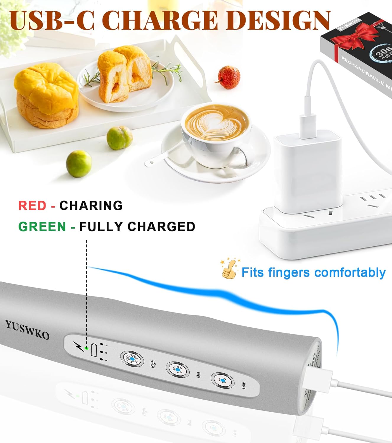 - 🎀【USB-C Rechargeable Milk Frother】This electric milk frother is powered by a built-in 1200mAh rechargeable battery, no need to replace any batteries, environmentally friendly and durable. Compared with the traditional Micro USB charging port, the USB-C charging port design makes it more compatible and faster charging. The charging indicator light is red when charging, and green when fully charged.