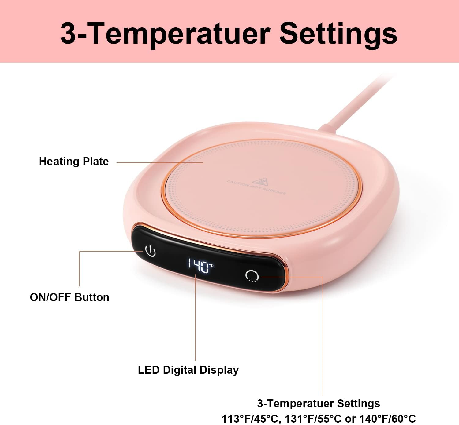 - 3 Temperature Settings: Coffee cup warmer will keep your coffee at a good drinking temperature, keeping beverage up to 113 ℉/45 ℃, 131 ℉/55 ℃ or 140 ℉/60 ℃ by touching the “Temp Setting Button”. You can enjoy your hot coffee any time