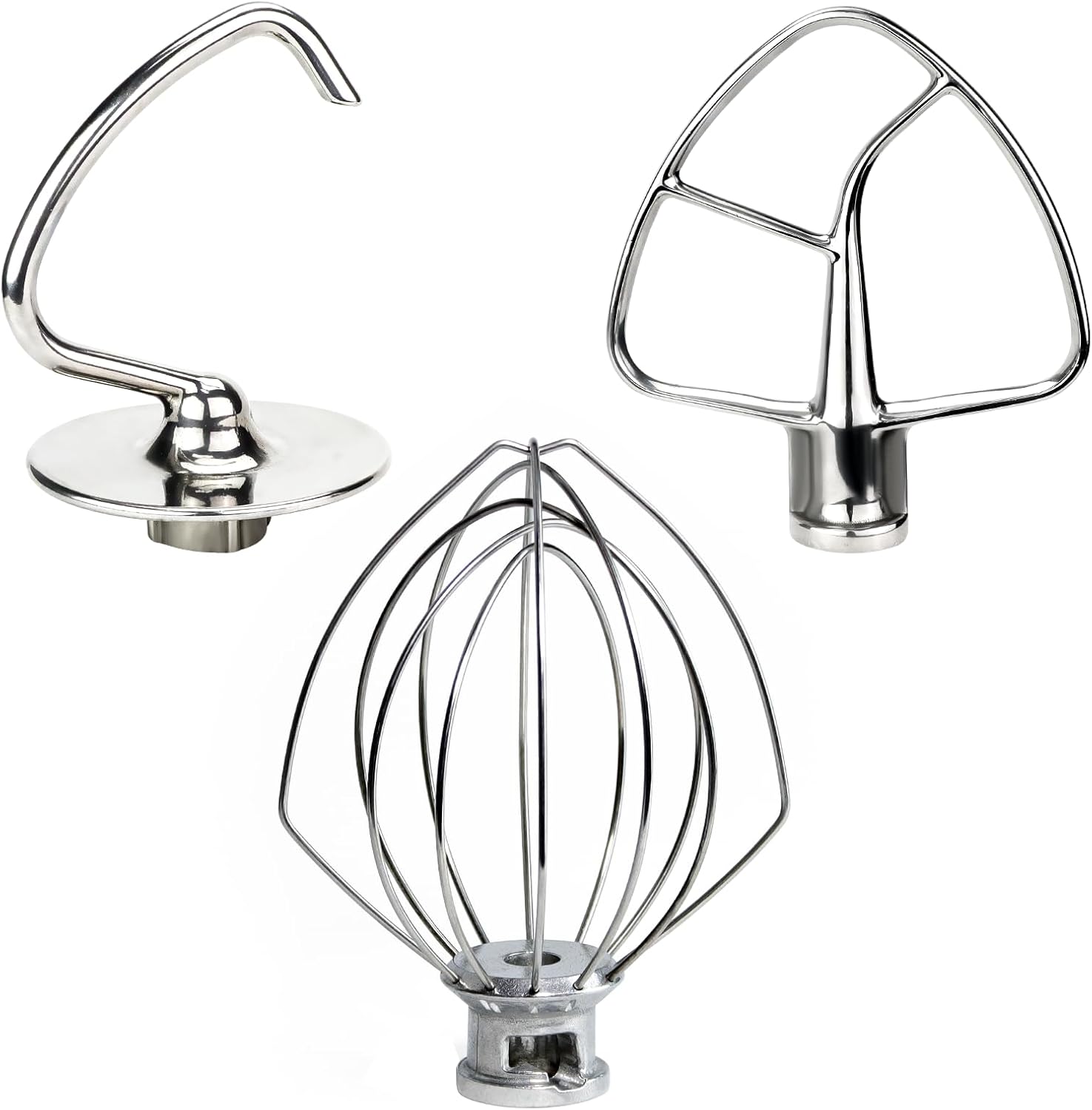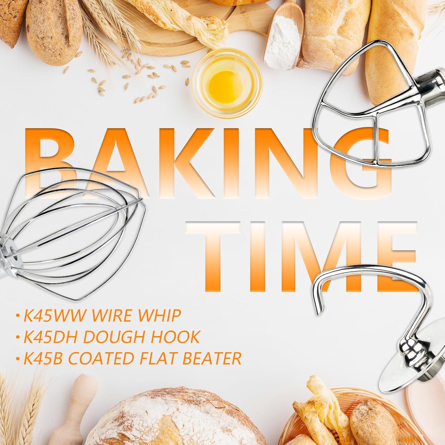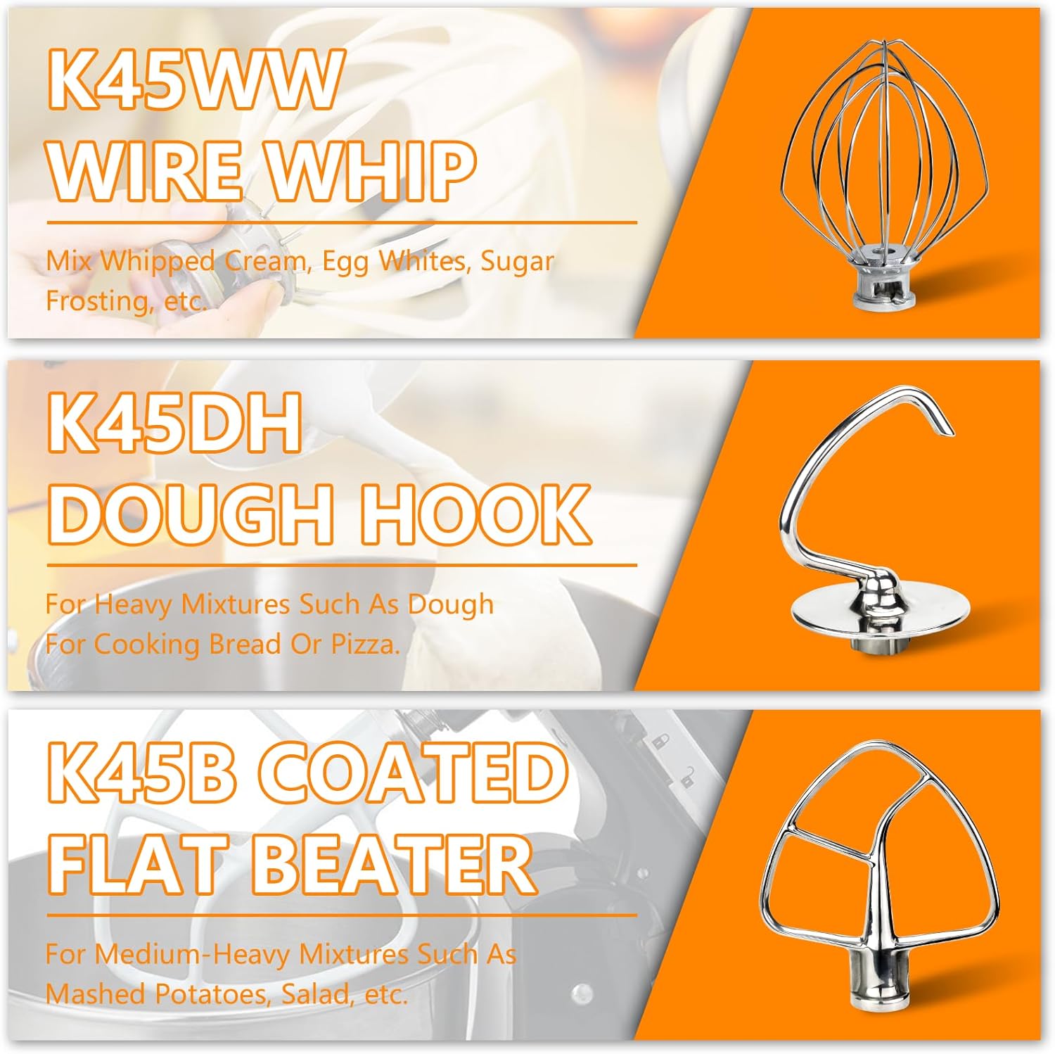 - ADVANCEMENT SET: The complete stainless steel mixer attachments contain 1 x K45WW wire whip, 1 x K45DH Coated Anti-stick dough hook and 1 x K45B coated Anti-stickflat beater for easy installation. And these replacement mixer attachments are made of stainless steel, coated well-tested by manufacturer for longevity, Not OEM parts but quality equal to OEM requirements even better (Please refer to the picture display for details)