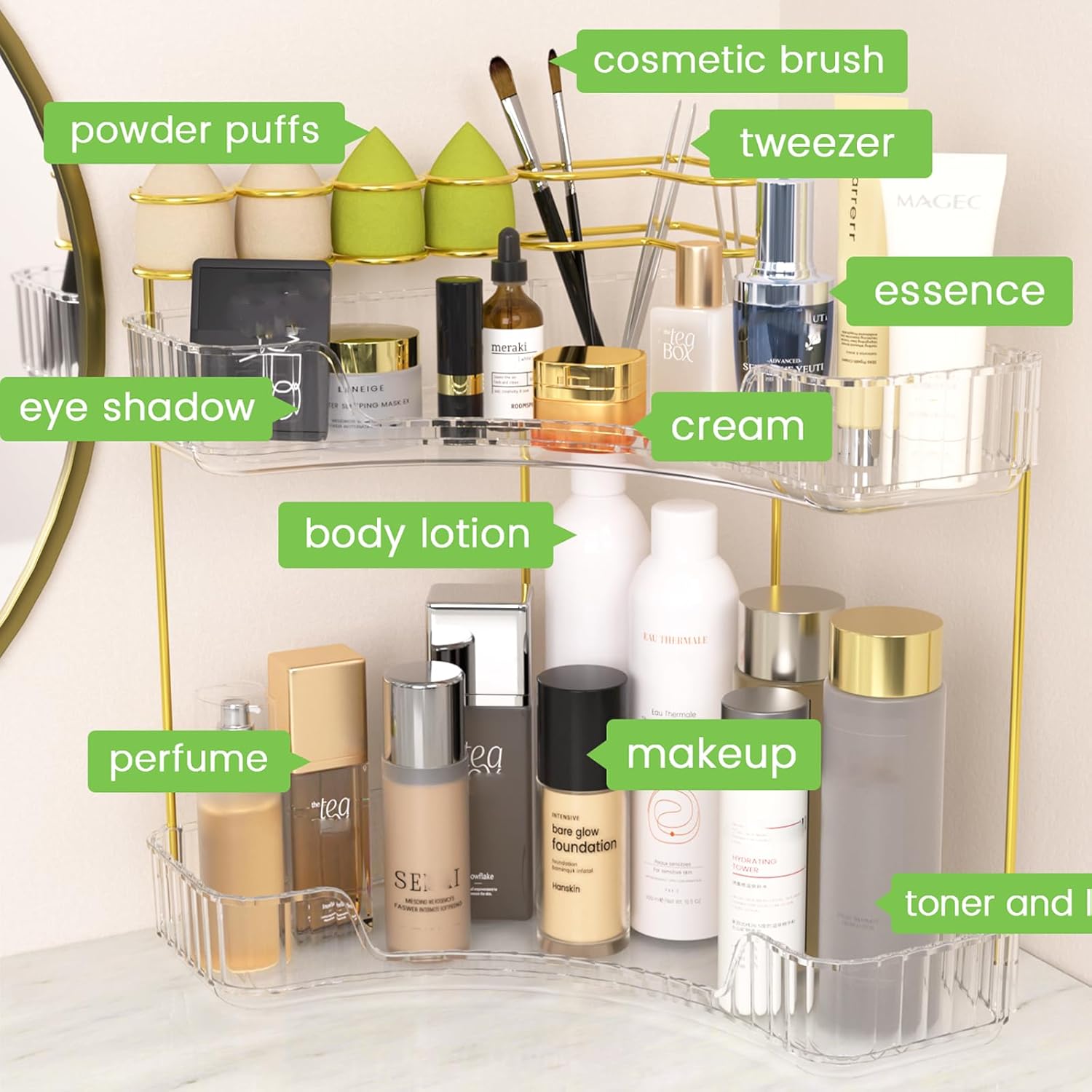 - 【Easily Assemble】2 tier corner bathroom organizer is 10*10*12 inch, large capacity perfect size and enough height for high toiletries as tall as shower gel, shampoo or skincares, makeup remover. A stylish and practical gifts for makeup enthusiasts, helping them keep their makeup collection well-organized