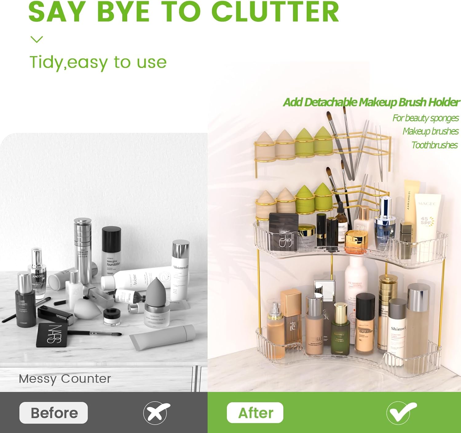 - 【Corner Makeup Organizer】Say goodbye to your cluttered countertop, our countertop organizer fully utilizes corner space, adding 100% extra storage space and keeping a tidy and organized bathroom counter