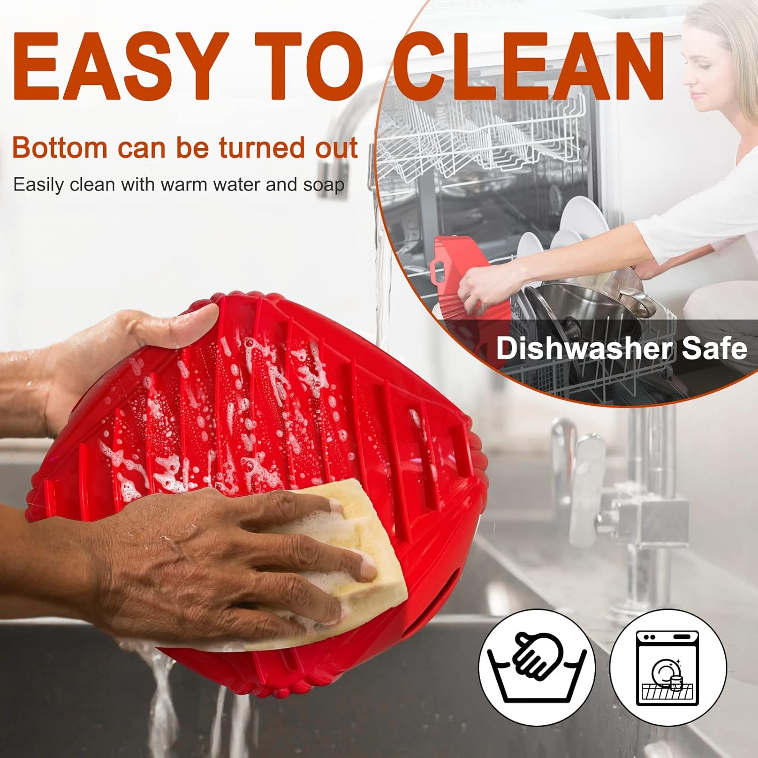 - Dishwasher Safe Air Fryer Silicone Liners - Made of food grade silicone, this large air fryer silicone pot can be put into dishwasher for easy cleaning, saving your time and effort to scrubbing the microwave air fryer basket pot and the kitchen mess after cooking. Also easy to wash by flipping the inside out and wipe with a cleaning brush.
