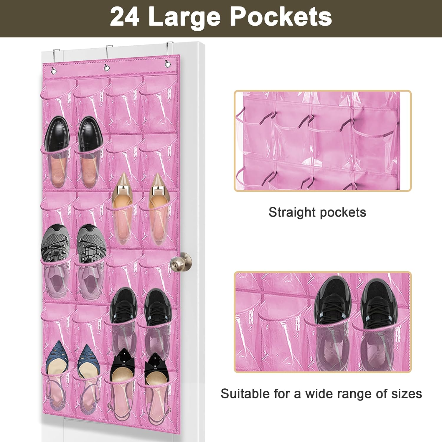 Over The Door Shoe Organizer - Space Saving Shoe Rack for Closet Door with 24 Pockets and Hook, Shoe Holder Back of Door Organizers for Shoes, Hanging Shoe Organizer (Pink)