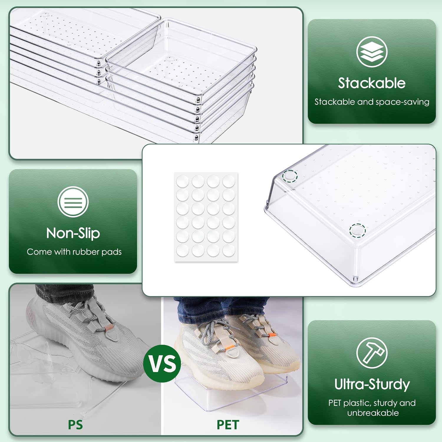 - 【Stackable & Non-Slip Design】Comes with non-slip silicone pads stickers, when the drawer suddenly opens or closes, the silicone pads will hold these organizers firmly in place. When not in use, the boxes can be stacked on top of each other to maximize your storage space.