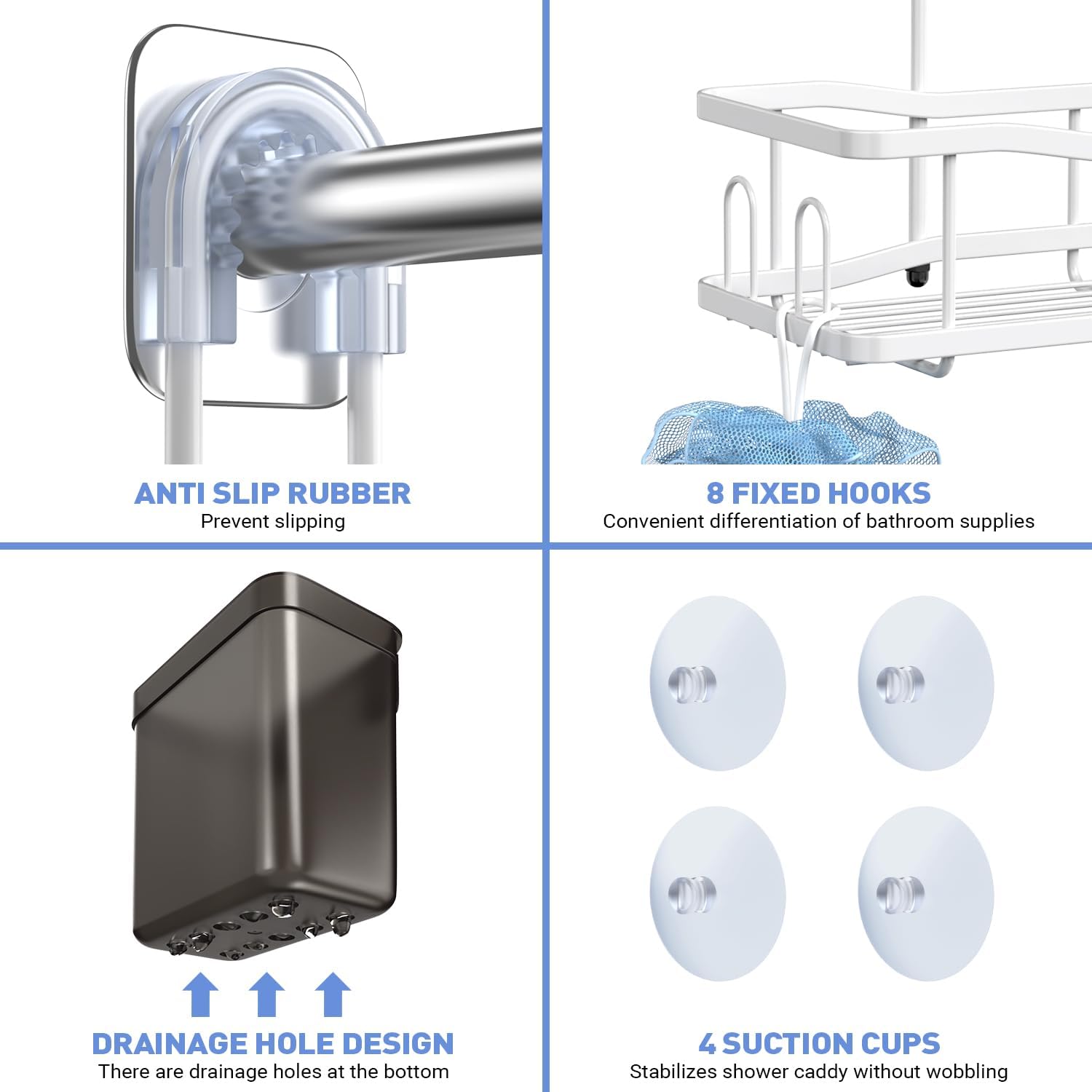 - ANTI-SLIP AND ANTI-SWING - The overhead bathroom shelves with anti-slip collar at the top, so you don't have to worry, it stays safely stable on your shower head. In addition 4 suctions is super sticky for flat surfaces, which holds the entire organizer in place without wobbling and shaking. Even if the shower organizer is full of bottles, the shower shelf will remain stable. It also won't lose its balance when you take the bottle in and out of the shower shelves.