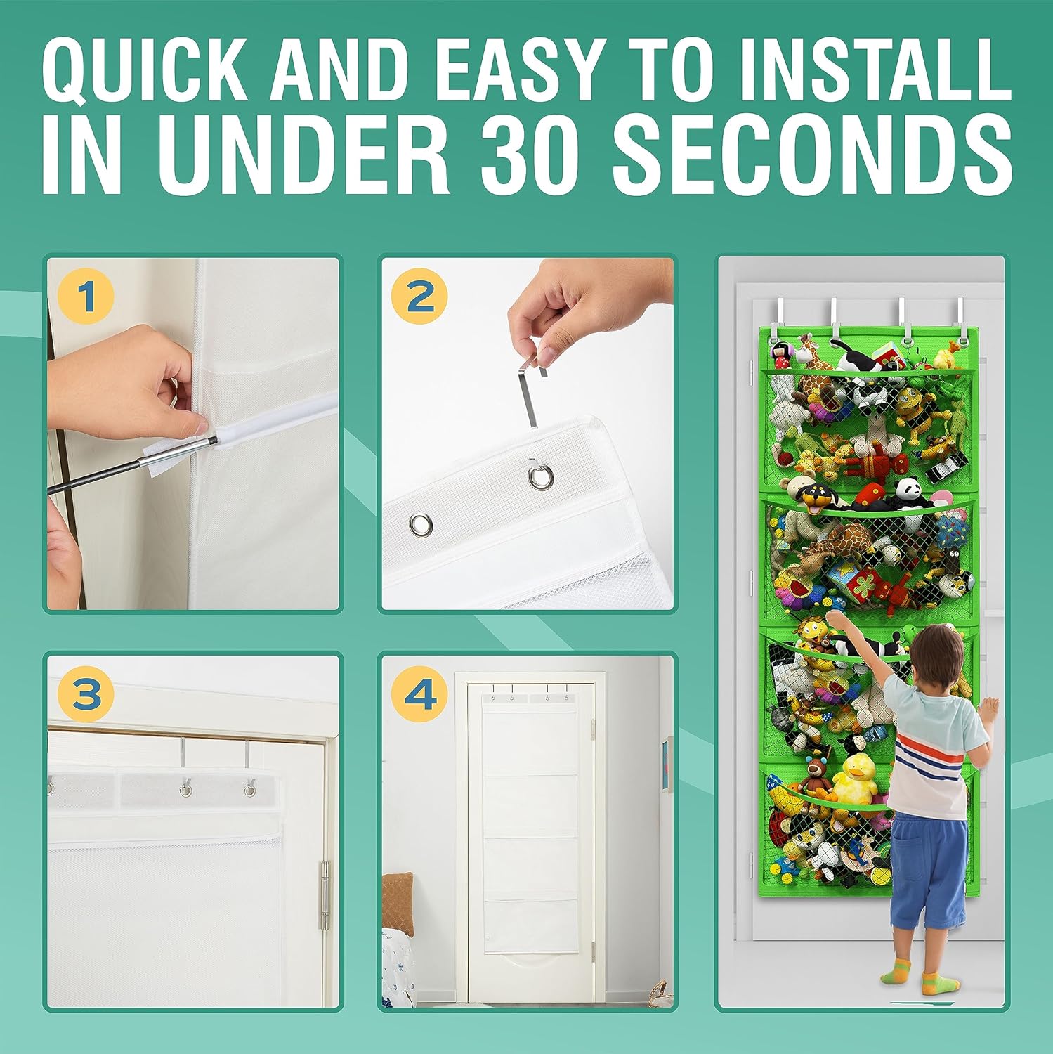- CONVENIENT STUFFED ANIMAL STORAGE - The perfect stuffed animal organizer to easily store and organize your favorite toys in our over the door storage unit. Easy to setup, durable, and allows kids convenient access to their toys. Equipped with breathable mesh pockets keeping your stuffies fresh and clean