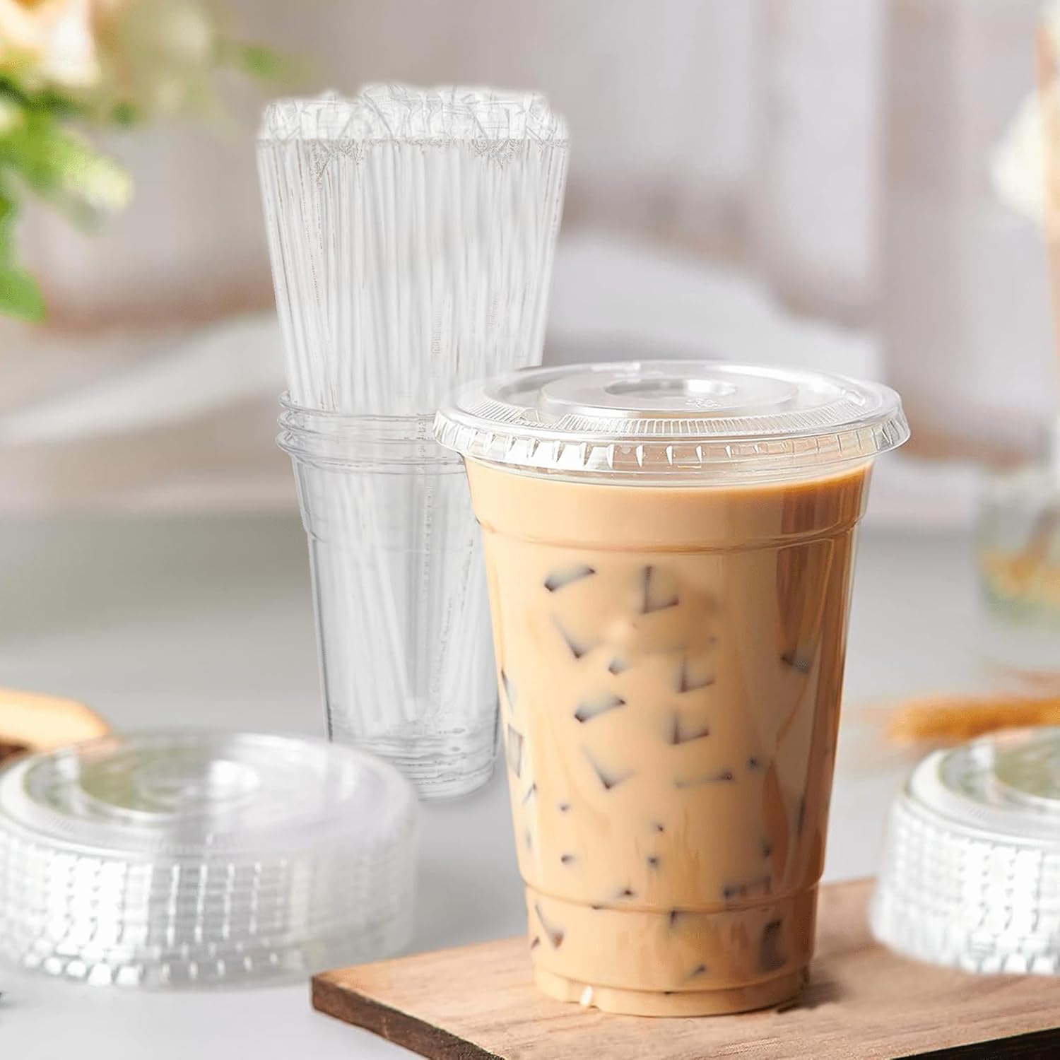 - 100 SETS FOR EACH PACK : Tashibox 16 oz clear cups with lids and straws-100 sets (100 cups &100 flat lids &100 straws )