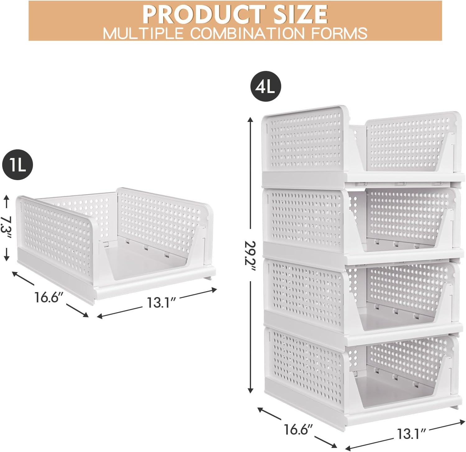 4 Pack Stackable Closet Storage Basket - Stackable Storage Bins, Multifunctional & Foldable Closet Organizer Divided, Wardrobe Cupboard Space-Saving Clothes Storage Hat Organizer, White