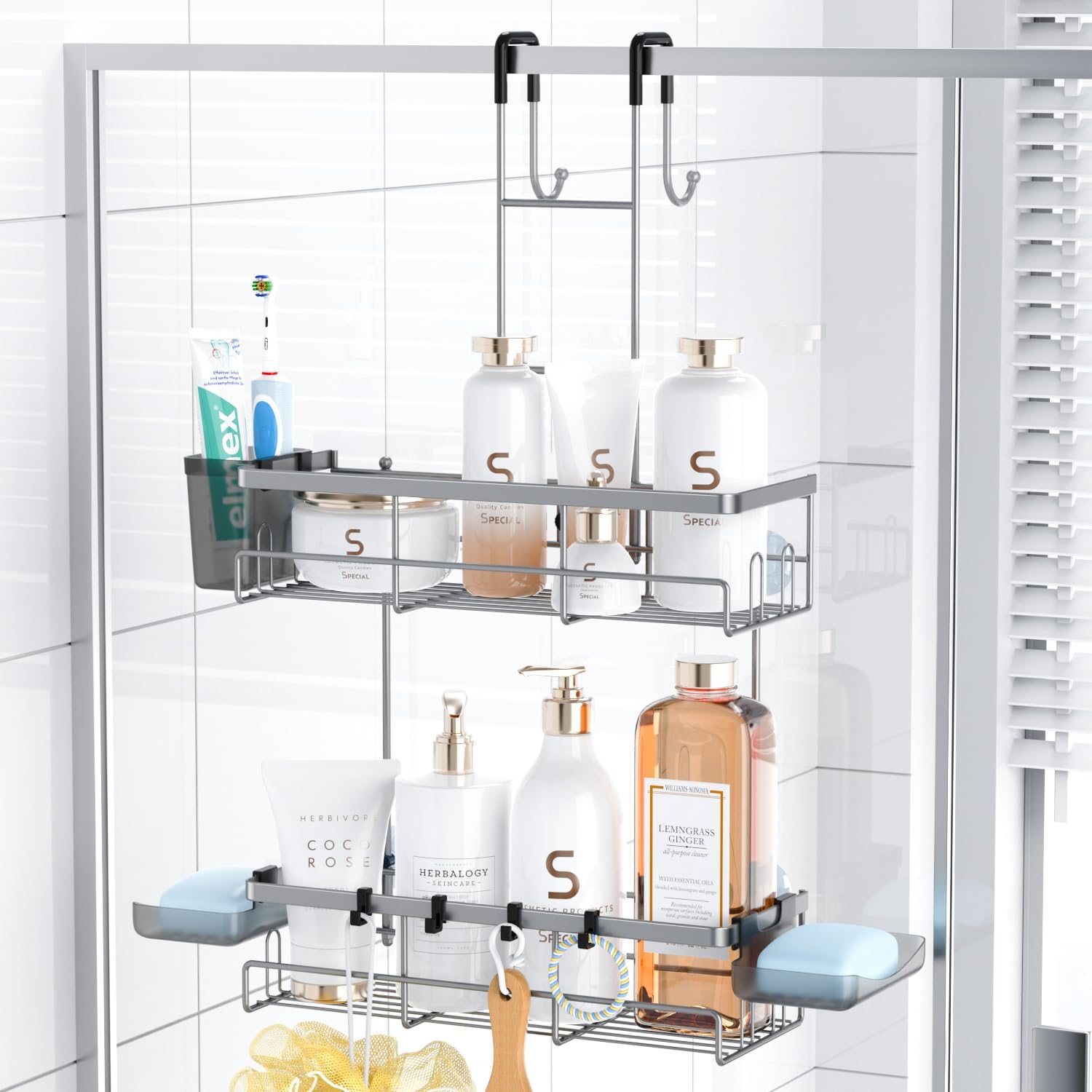 - LARGE CAPACITY SHOWER CADDY: Tired of dealing with a cluttered bathroom. Our over the door shower caddy will help you solve it. It features a 2-tier design with spacious storage space of 12.5*5.3*24 inches. our shower organizer hanging are designed with 2 shower racks, 2 soap holders, 1 toothbrush holder and 4 removable hooks, and multiple hooks on the shelf, making it easy for you to organize your body wash, shampoo, towels , soap, razors, and toiletries. An ideal shower organizers and storage.