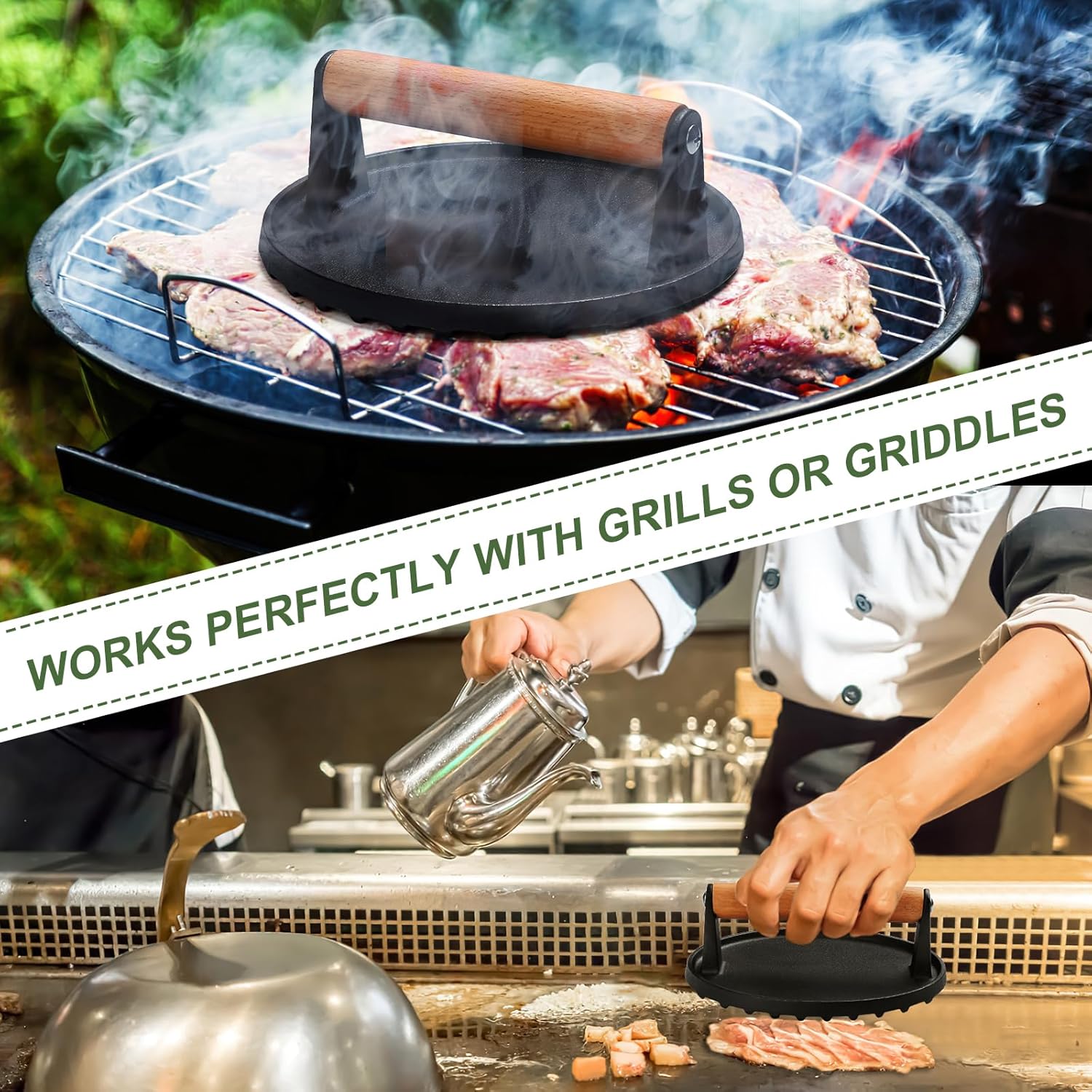 - 【WIDE APPLICATIONS】: Bacon press for griddle is a professional indoor kitchen and outdoor BBQ, camping flat top grill tool. The smash burger press can be used on various surfaces, including grills, griddles, flat tops, teppanyaki, skillets pans, and induction stoves. Ideal for food like bacon, sandwich, burgers, chicken, steak, Paninis.