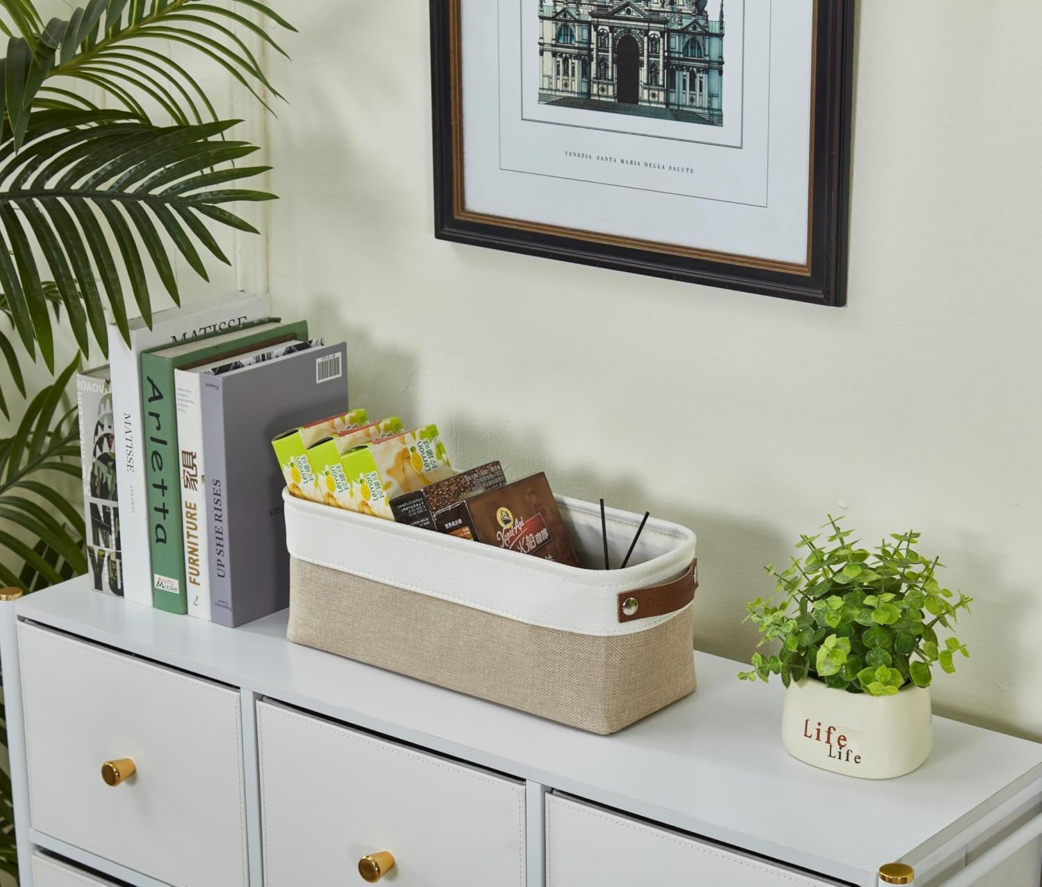 - Attractive Design: Our small basket has a sleek design and comes with two faux leather handles and a dual-color exterior. These organization baskets have a modern and luxurious feel with a functional design.