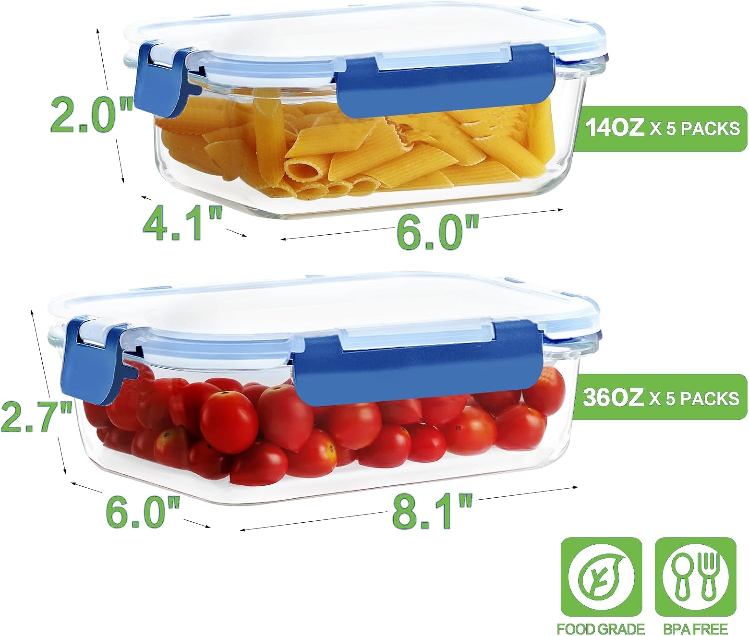 10 Pack Borosilicate Glass Meal Prep Containers with Locking Lids, Glass Food Storage Containers Set, Airtight Lunch Bento Boxes, BPA-Free & Leak Proof, 36oz & 14oz, Freezer, Oven Safe-Deep Blue