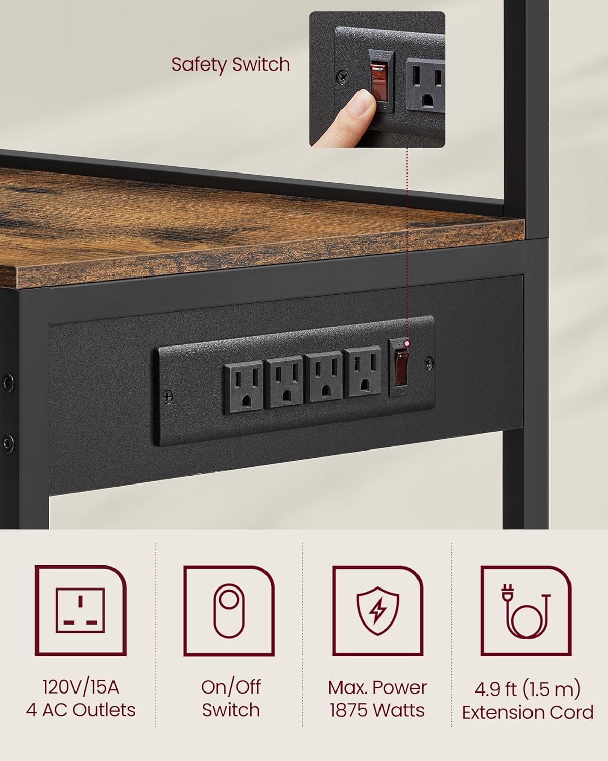 - [Safe Charging Station] This baker's rack features a power outlet with 4 AC outlets, equipped with overload, leakage protection, and an on/off switch, ensuring safe powering of multiple appliances