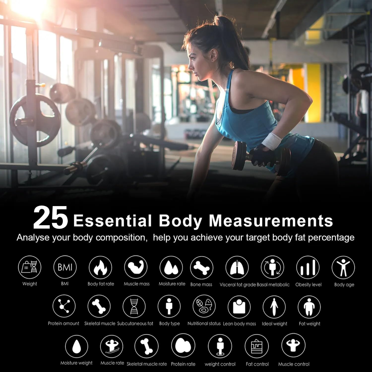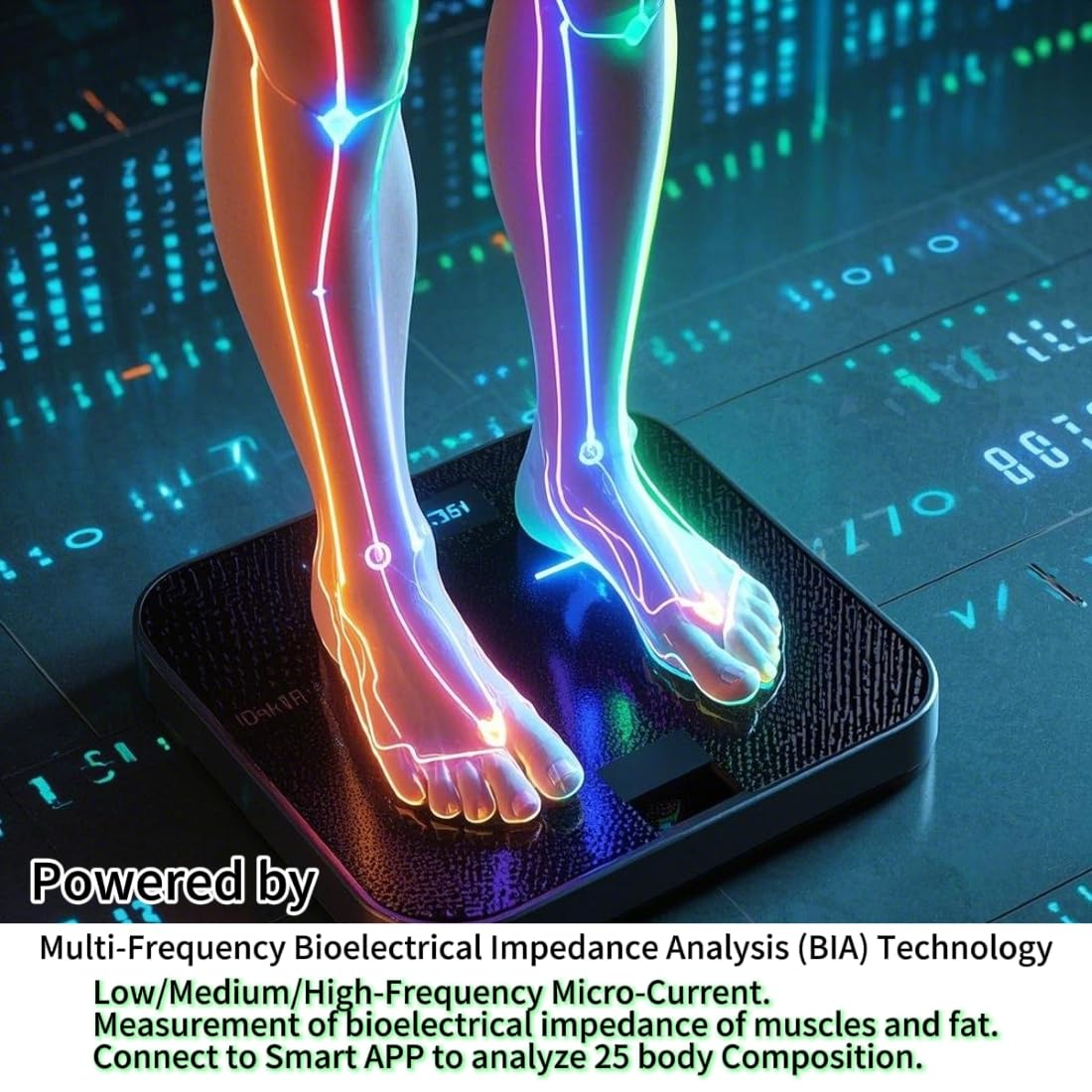 - 25 Essential Body Composition:Smart scales powered by Multi-Frequency Bioelectrical Impedance Analysis (BIA) Technology, Using Low/Medium/High-frequency microcurrents Measure BMI, body fat, fat-free body weight, subcutaneous fat, visceral fat, body water, skeletal muscle rate, muscle mass, bone mass, proteins, BMR & biological age and so on. More in-depth analysis of your body composition than Single-Frequency body weight scales.