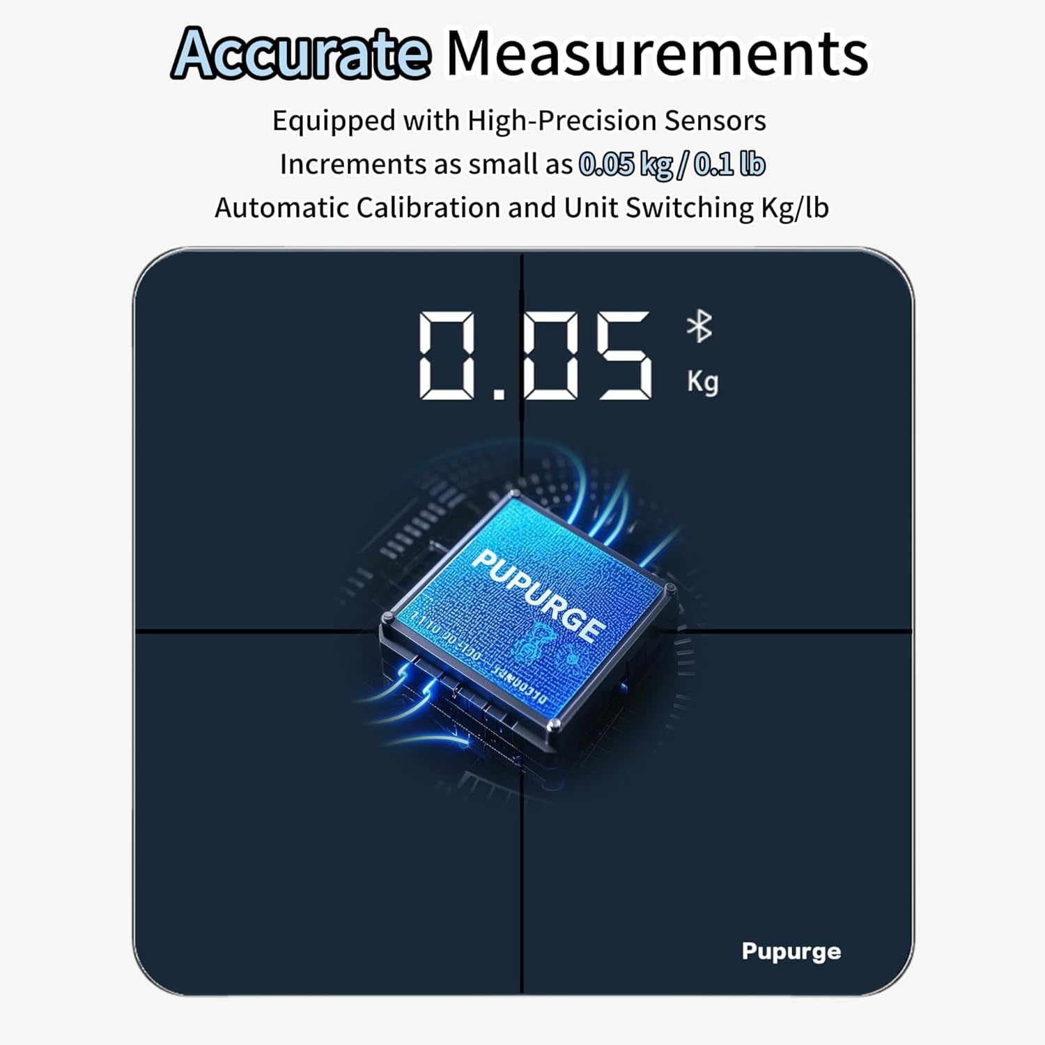 - High-precision digital bathroom scales: PUPURGE body fat scale uses high-precision sensors and ITO technology. Compared with other four-electrode body weight scales, this ITO body scale provides a larger sensing area for your feet, The measurement result is accurate to 0.05kg / 0.1lb, Weighing scale for body weight up to 180kg / 400lb.