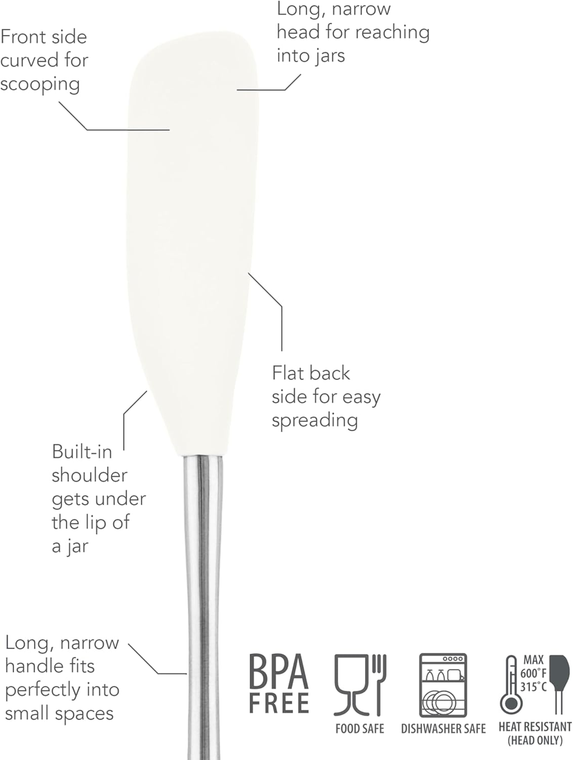 - CURVED SCOOPING ACTION: The curved silicone head design helps scoop food efficiently while the flattened back spreads condiments evenly plus the specially designed curved shoulder swipes smoothly along jar lips to capture everything inside without leaving residue behind