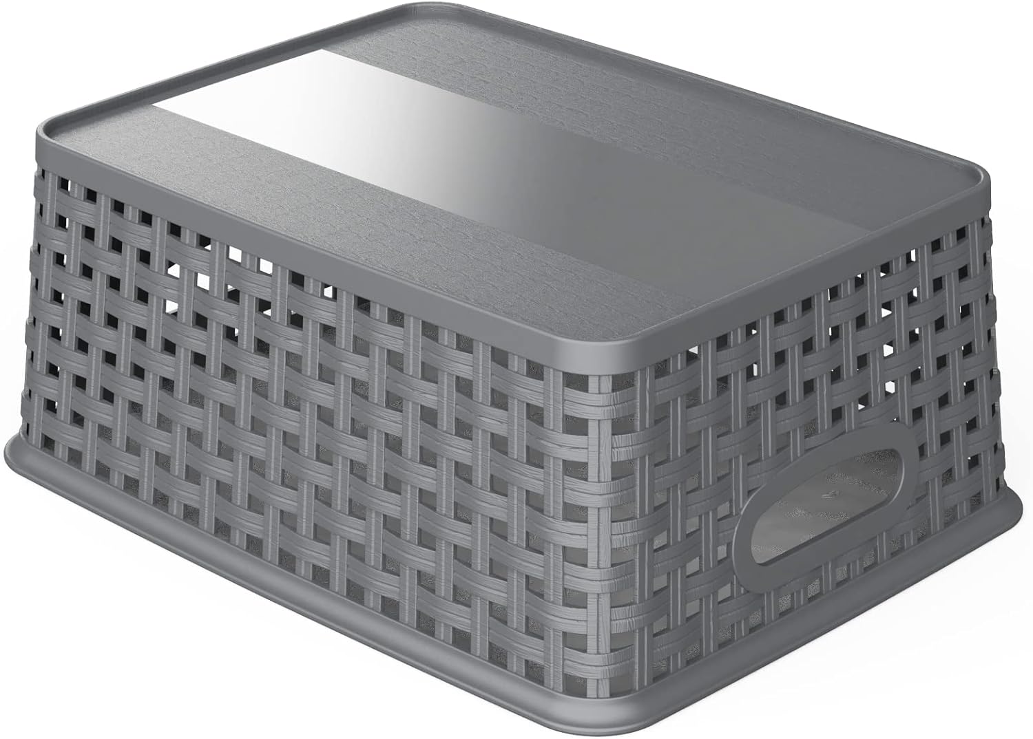 - Simplify gray plastic small storage baskets are hassle-free stack able when not in use for maximum space utilization, and its combined tote allow you to move them with ease. Take it wherever you need storage.