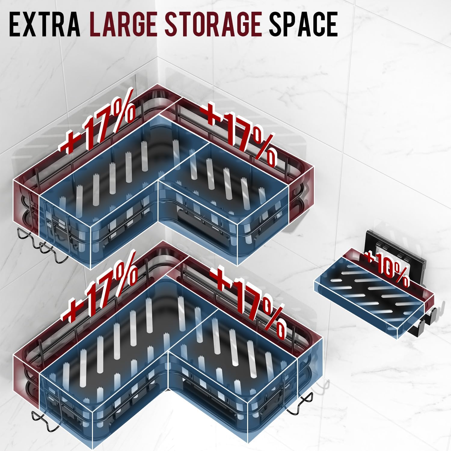 - Space-Saving Appeal - Newly upgraded Getsrichfc L-shaped corner shower caddy 3 piece set is designed to maximize corner space. Excellent shower organizer holds most of the toiletries in your bathroom. Novel and simple exterior design and great storage capacity to keep your bathroom tidy and clean at all times
