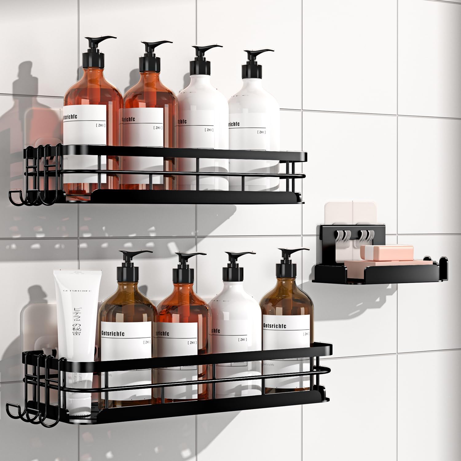 - 【Maintain Balance and Absolute Stability】- The newly upgraded 3M Clear No-Scratch Adhesive is ultra-reliable and can hold up to 50 pounds. Which is equal to 22 bottles of 35oz shampoo/ shower gel/ body lotion weight. Keep the tins and bottles in the bathroom shelf organizers, and make them easy to fetch and use. Never worry about falling issues after proper installation