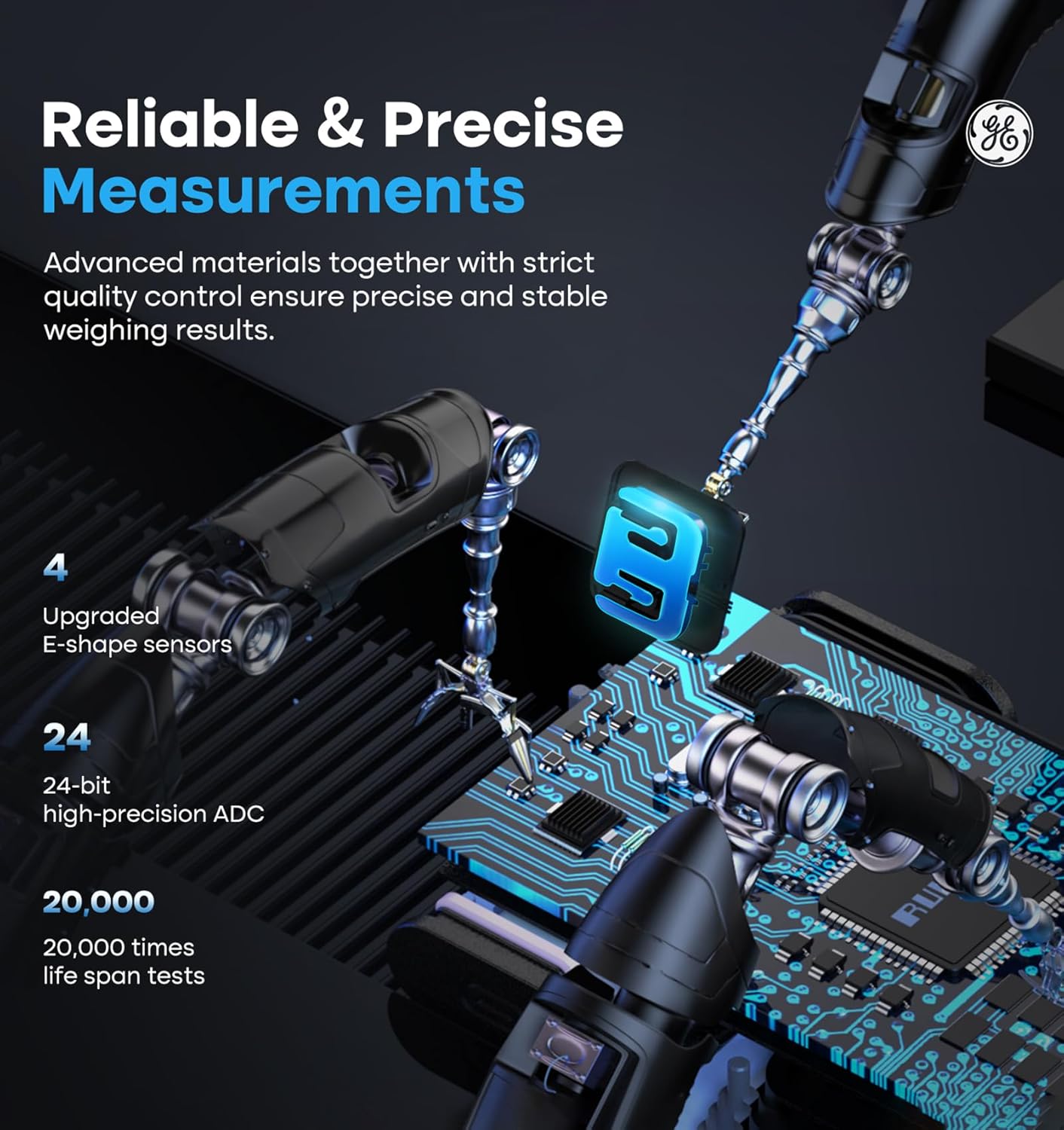 - Extensive Body Metrics Tracking: The GE Fit Plus Smart Body Fat Scale offers a detailed analysis of nine vital health metrics, including body weight, body fat percentage, muscle mass, body water, visceral fat, fat-free body weight, BMI, BMR, and bone mass. All data is seamlessly transmitted to your smartphone via Bluetooth, aiding you in achieving your health objectives more efficiently